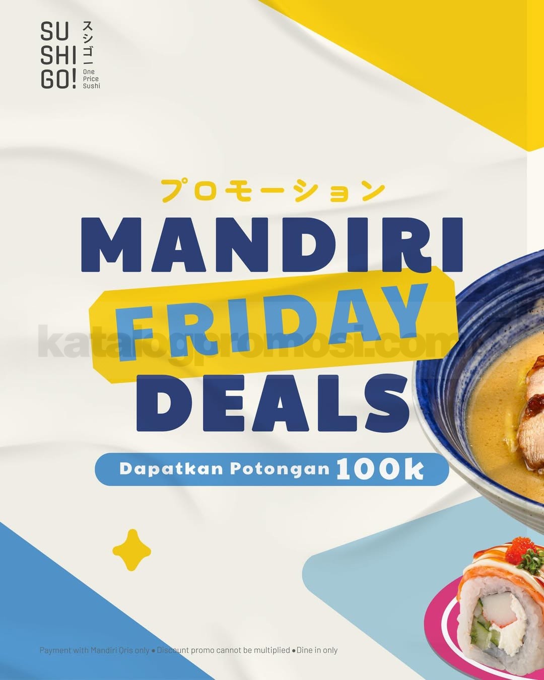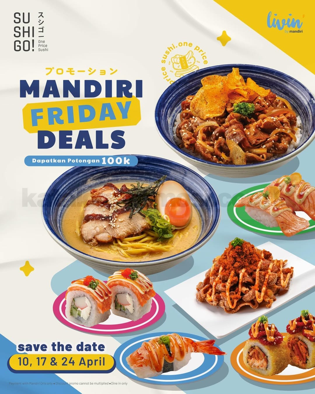 Promo Sushi Go Mandiri Friday Deals Diskon Rp. 100.000 potongan transaksi berlaku mulai tanggal 10 April – 24 April 2026 di seluruh outlet dengan QRIS Mandiri