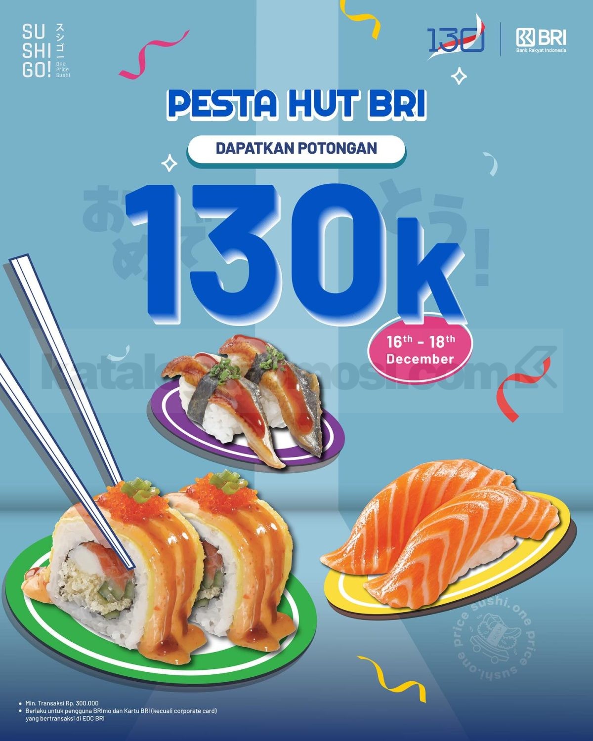 Promo Sushi Go Pesta HUT BRI Potongan Rp.130.000 untuk transaksi min. Rp300 ribu dengan BRImo, Debit, atau Kartu Kredit BRI, berlaku 16–18 Desember 2025.