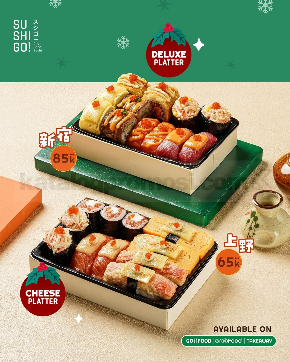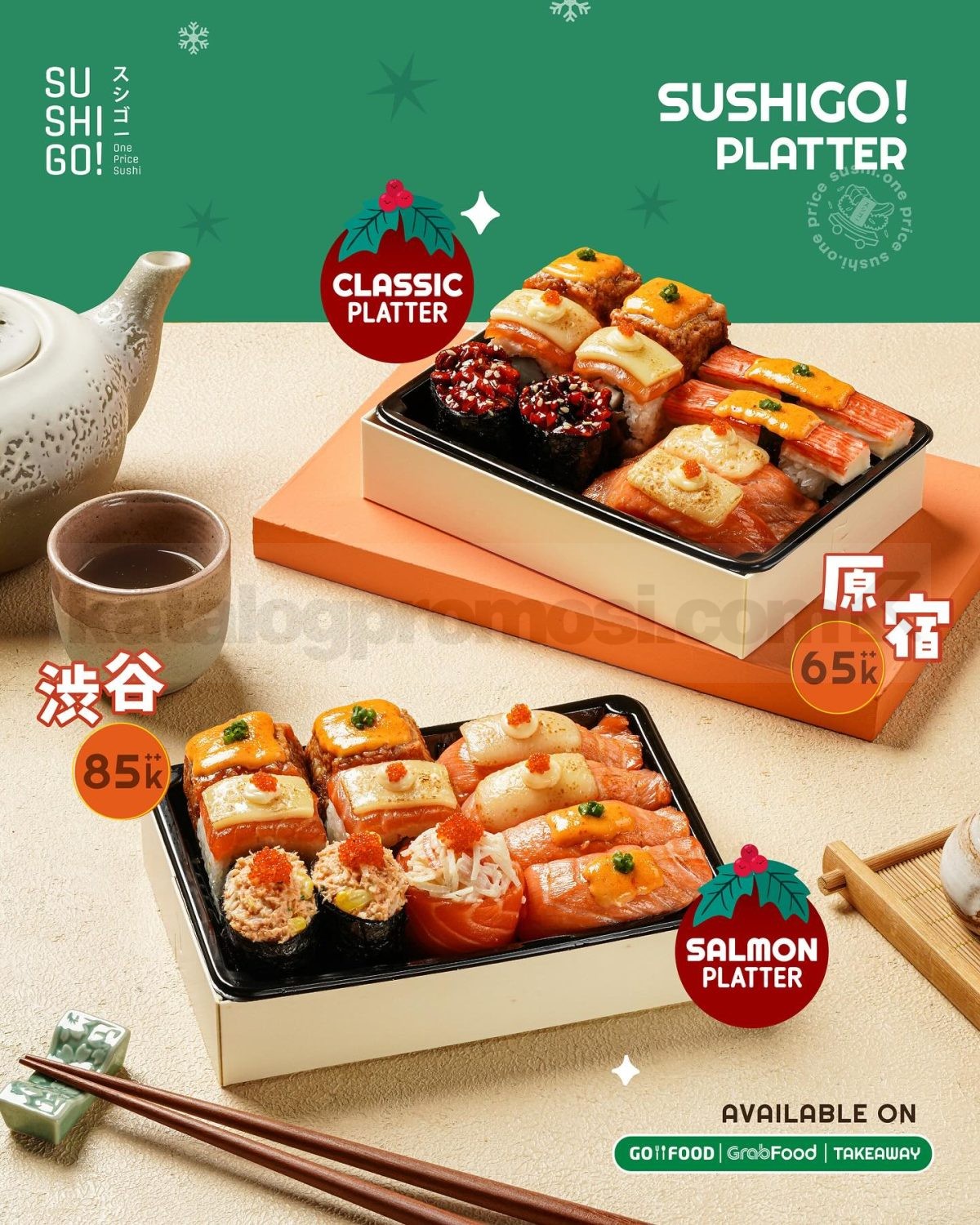 Promo Sushi Go! Platter mulai Rp. 65.000++ dengan berbagai pilihan menu platter, pemesanan via GoFood, GrabFood, dan take away, berlaku selama persediaan masih ada.