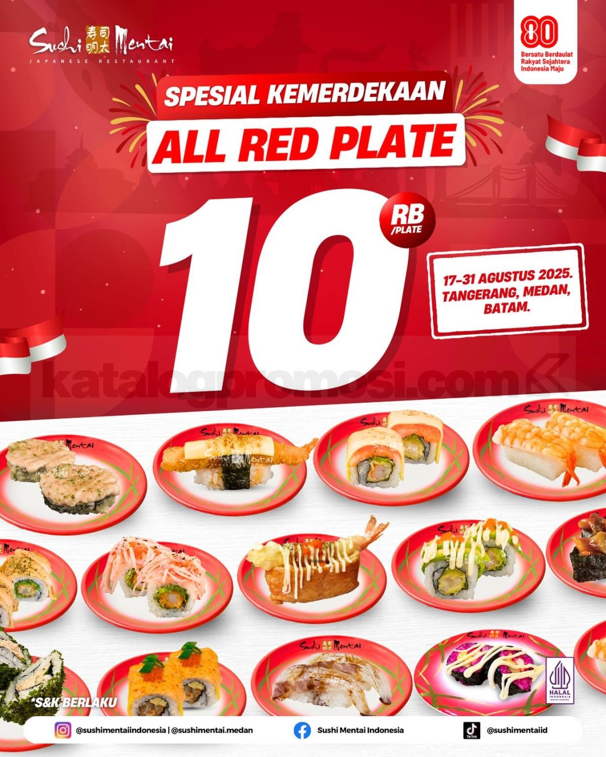 Promo Sushi Mentai All Red Plate Rp. 10ribu berlaku di outlet Tangerang, Medan, dan Batam mulai tanggal 17-31 Agustus 2025, buruan serbu!