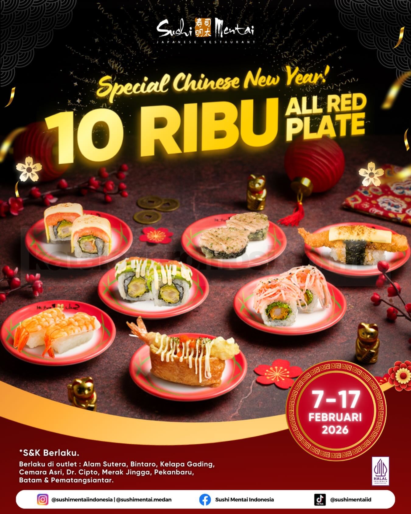 Promo Sushi Mentai Special Chinese New Year All Red Plate Rp. 10.000 dengan harga spesial untuk semua sushi red plate dine-in, berlaku mulai tanggal 7-17 Februari 2026 di lokasi tertentu.