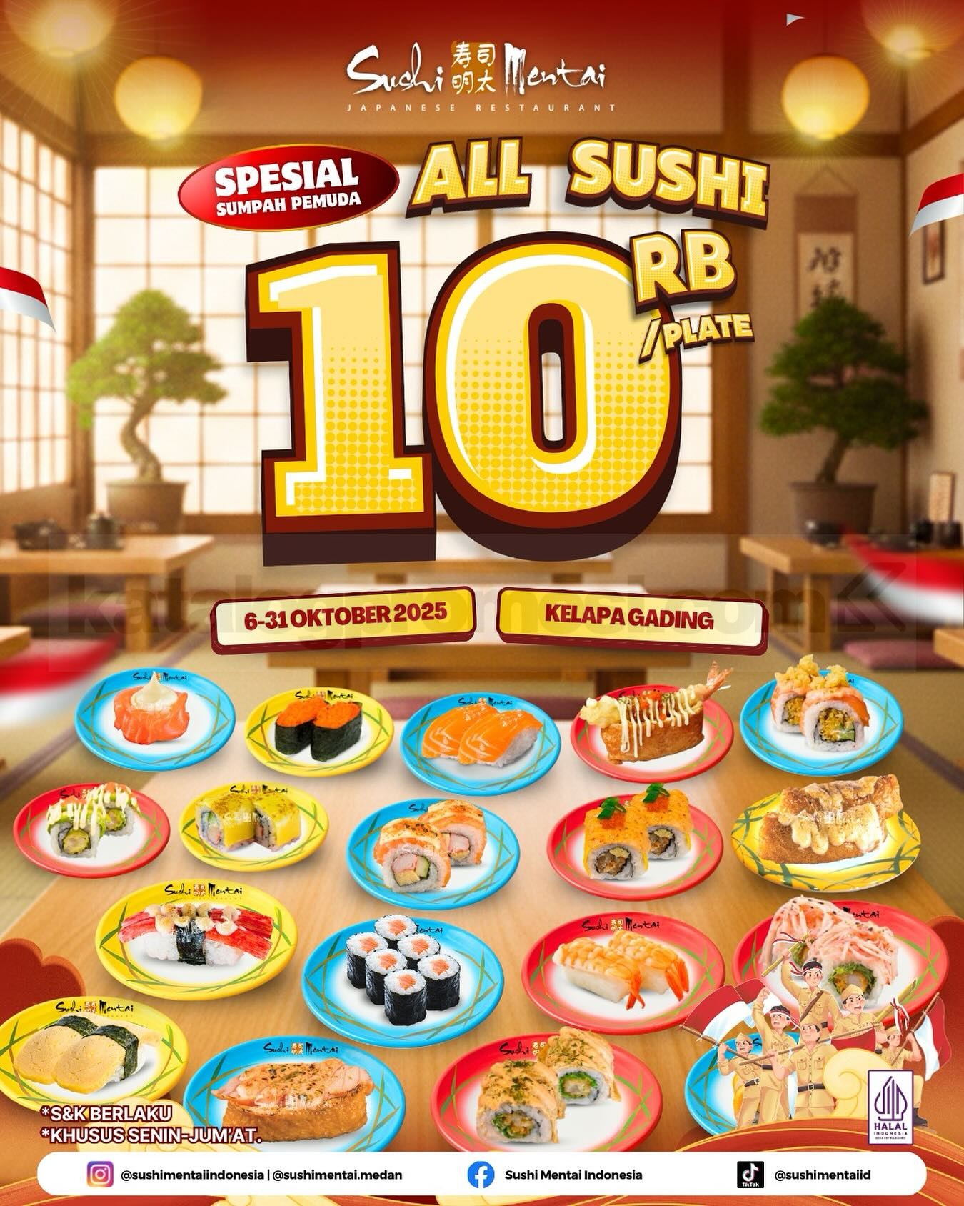 Promo Sushi Mentai Spesial Sumpah Pemuda All Sushi Rp10Ribu/Plate Berlaku di Sushi Mentai Kelapa Gading mulai tanggal 6-31 Oktober 2025 Khusus Senin-Jum’at.