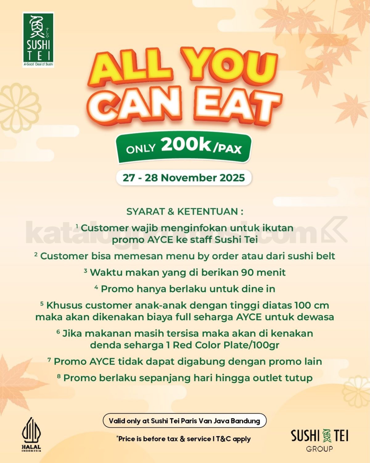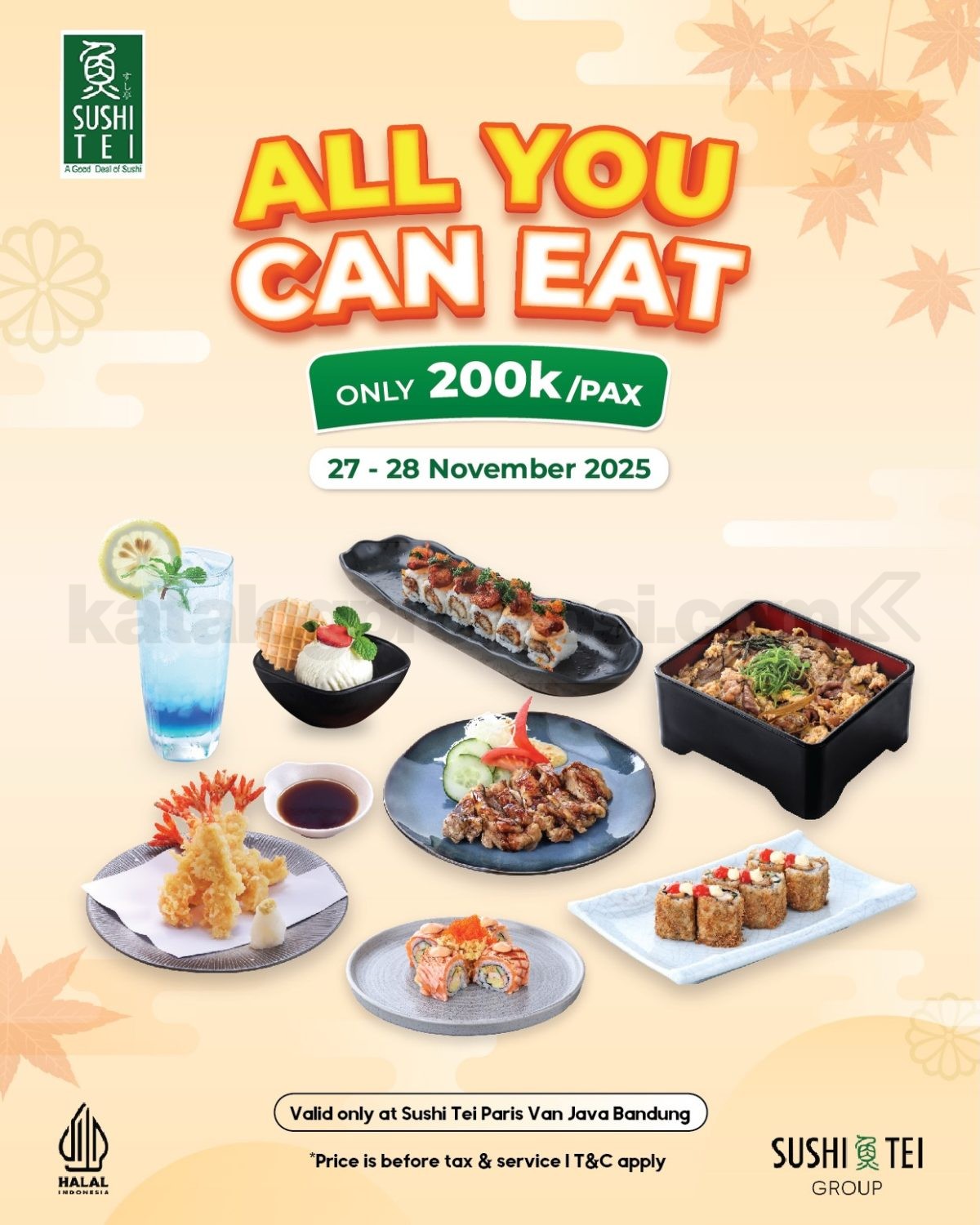Promo Sushi Tei Bandung All You Can Eat Rp. 200.000 di Sushi Tei PVJ dengan detail harga dan periode 27–28 November 2025. Promo Sushi Tei Bandung All You Can Eat Rp. 200.000 1