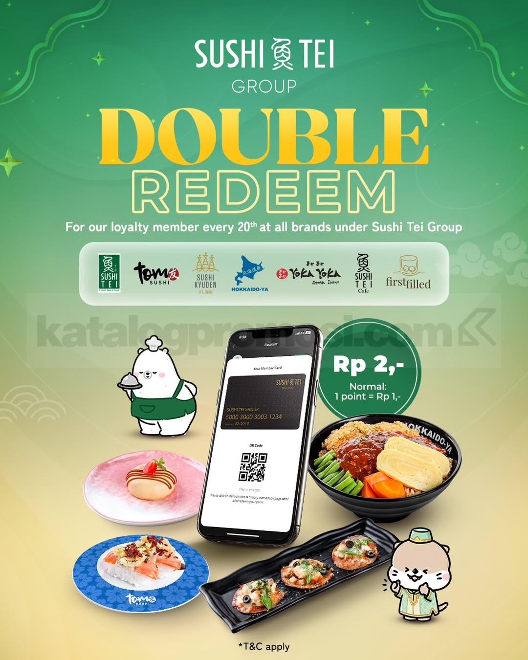 Great news! Promo Sushi Tei Double Redeem 1 Point Rp. 2 ini kembali untuk Loyalty Members setia yang ingin menikmati menu favorit dengan penukaran poin lebih maksimal. Dalam promo spesial ini, setiap 1 poin yang biasanya bernilai Rp. 1,- kini menjadi Rp. 2,- sehingga kamu bisa redeem lebih banyak untuk transaksi makan di tempat maupun take-away. 🍣✨