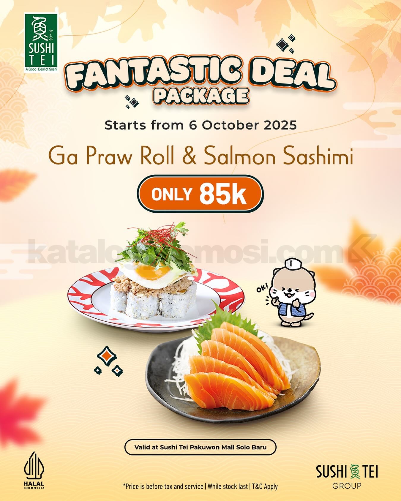 Promo Sushi Tei Fantastic Deal Ga Praw Roll & Salmon Sashimi cuma Rp85K, Berlaku mulai 6 Oktober 2025.