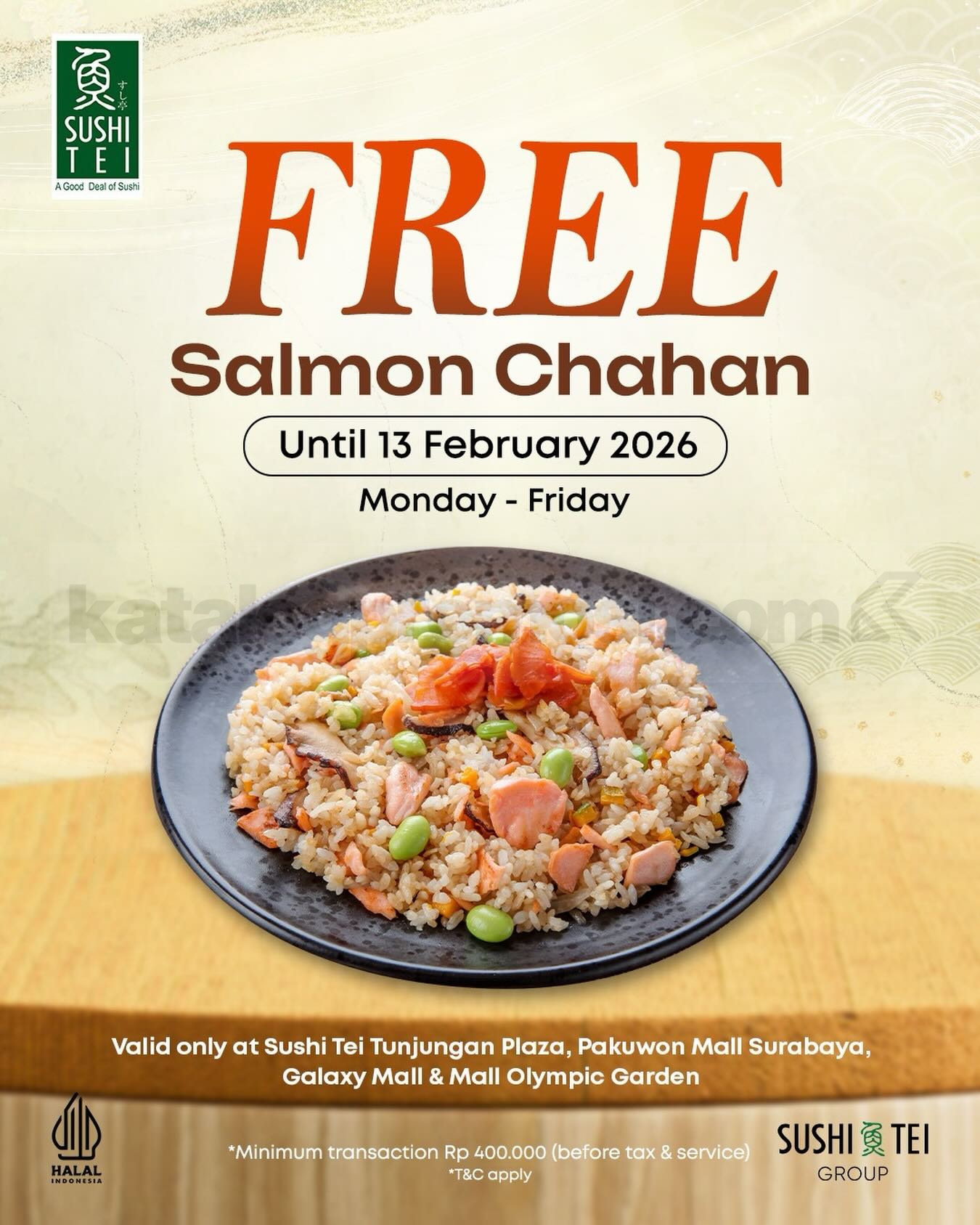Promo Sushi Tei FREE Salmon Chahan dengan minimum transaksi Rp. 400.000 sebelum pajak & service untuk dine-in Senin–Jumat, berlaku hingga 13 Februari 2026 di lokasi tertentu.