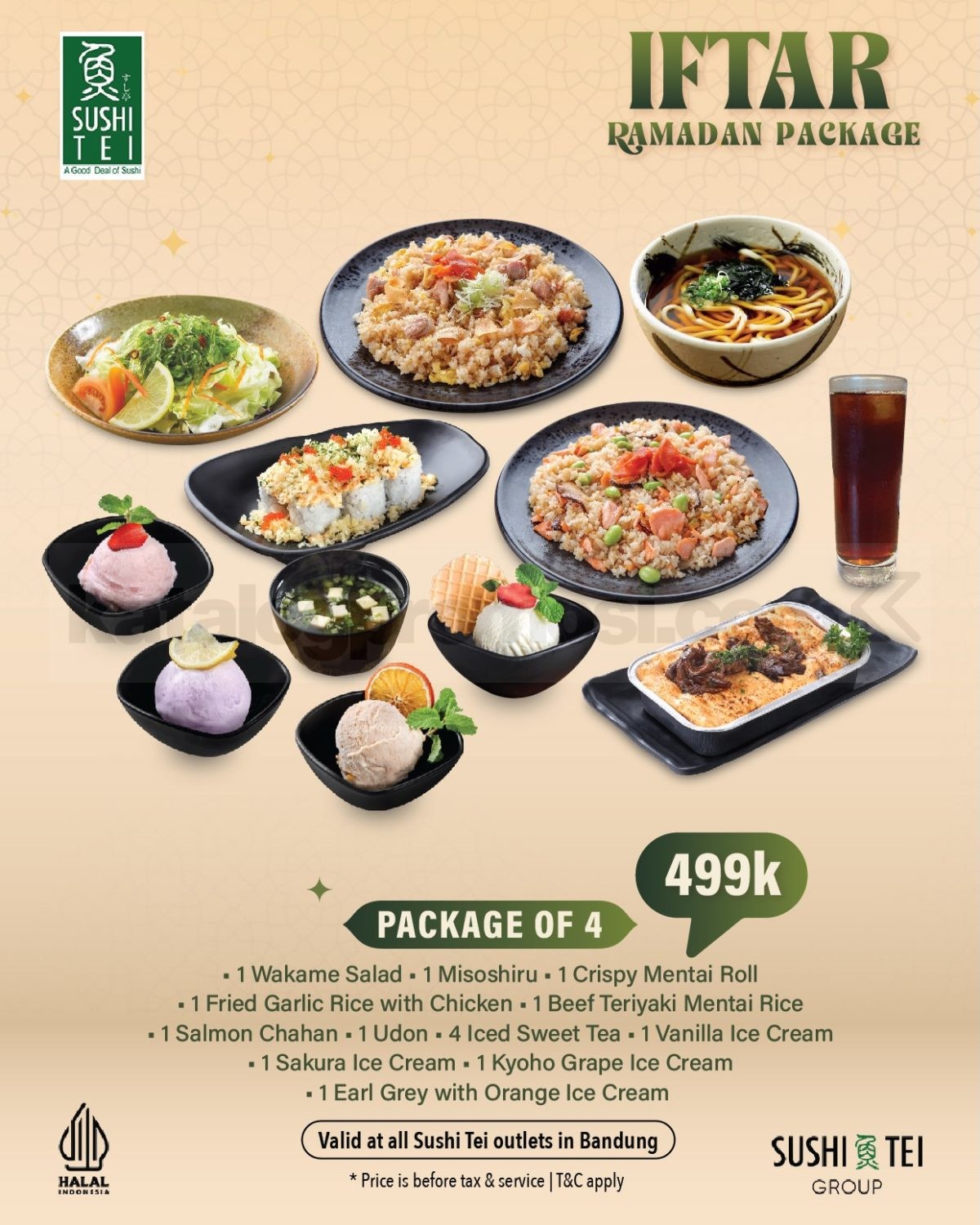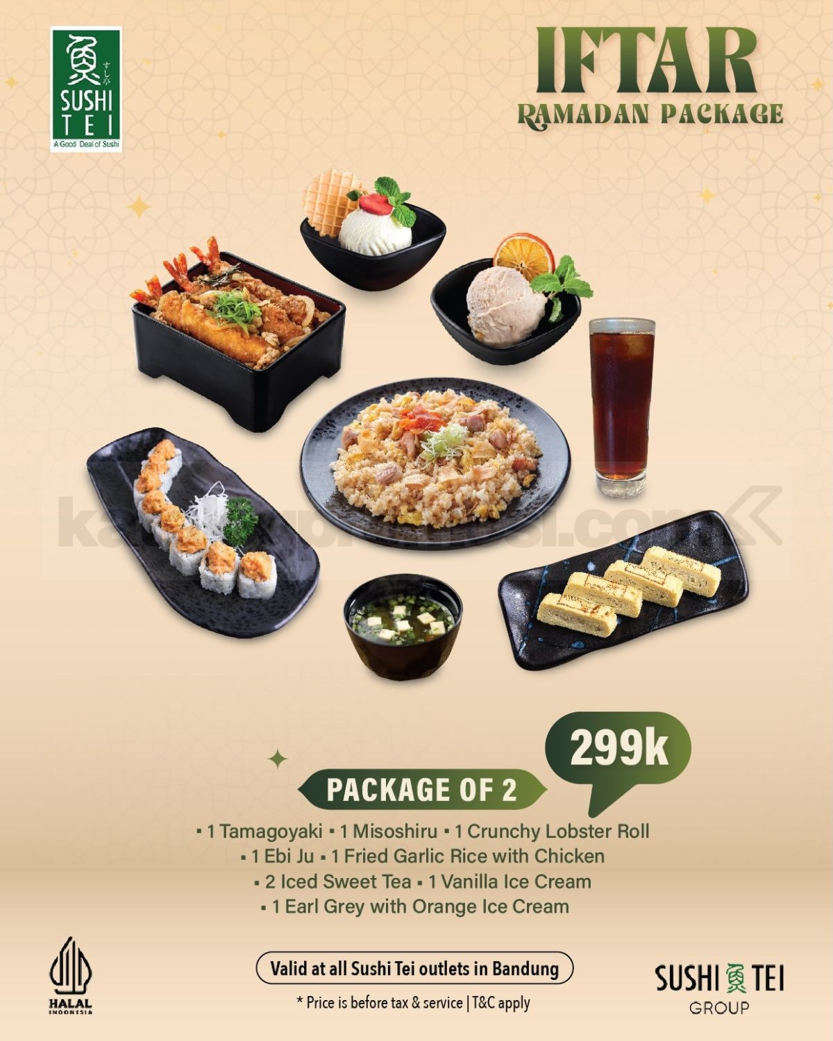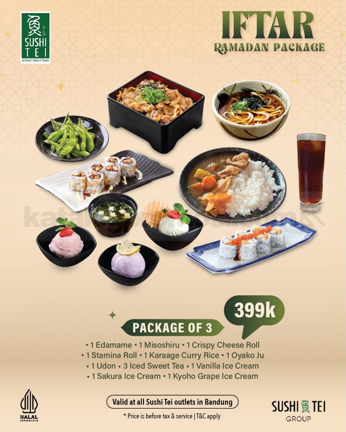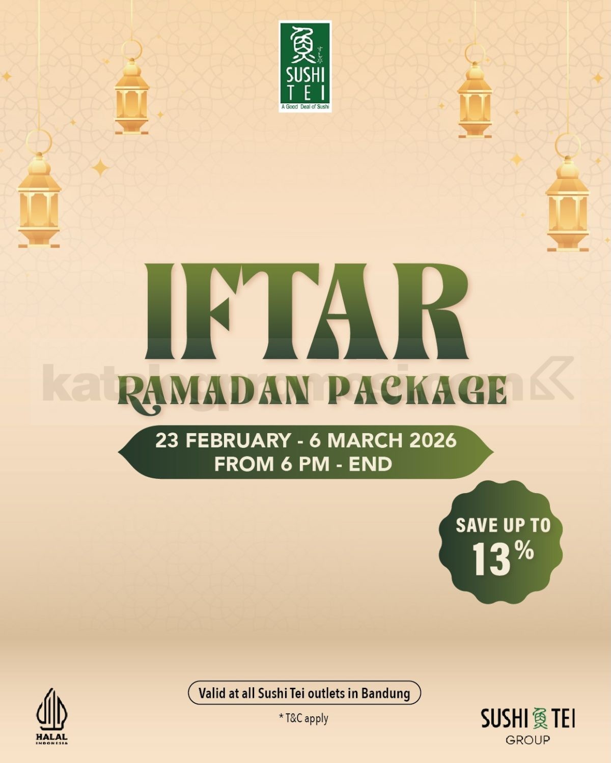 Promo Sushi Tei IFTAR RAMADAN PACKAGE Hemat 13% paket 2–4 orang harga mulai Rp. 299.000 periode 23 Februari – 6 Maret 2026 pukul 18.00 – selesai khusus outlet Bandung dan dine-in.