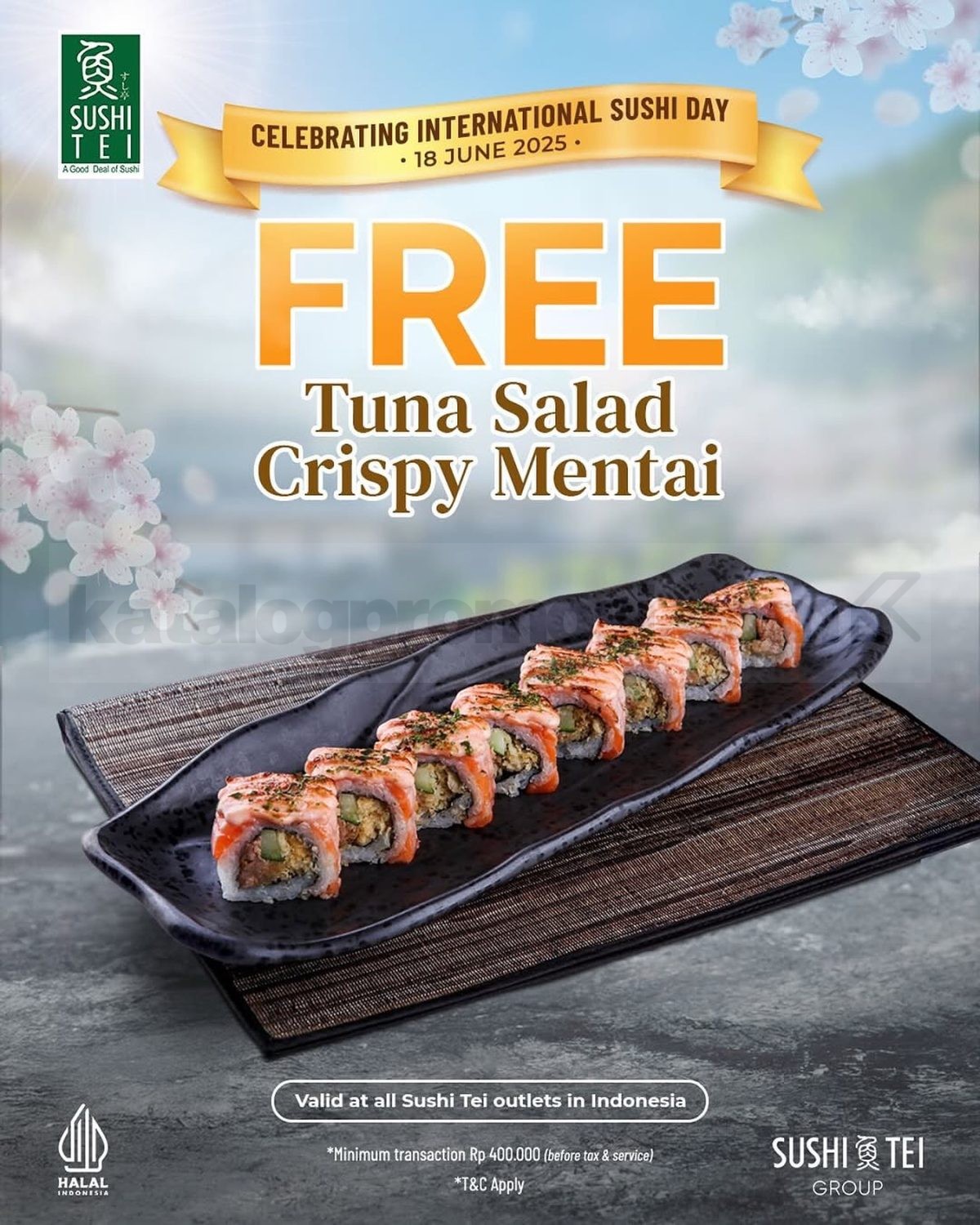 Rayakan International Sushi Day bareng Sushi Tei dan nikmati gratis Tuna Salad Crispy Mentai untuk kamu yang melakukan transaksi minimum Rp400.000 (sebelum pajak & servis) khusus tanggal 18 Juni 2025.