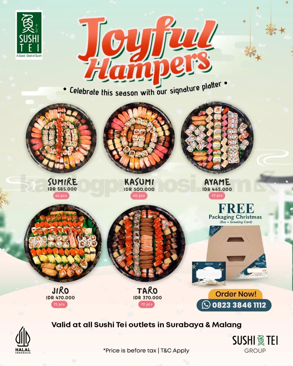 Promo Sushi Tei Joyful Hampers mulai Rp. 370.000 dengan pilihan paket lengkap untuk keluarga, berlaku selama persediaan masih ada di lokasi tertentu.