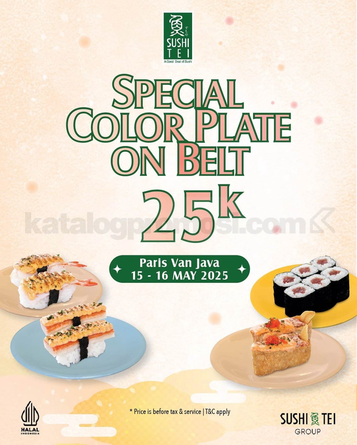 Promo SUSHI TEI Special Color Plate On Belt cuma Rp25.000 per plate berlaku 25–27 Agustus 2025 khusus dine in di Sushi Tei Flamboyant Bandung.