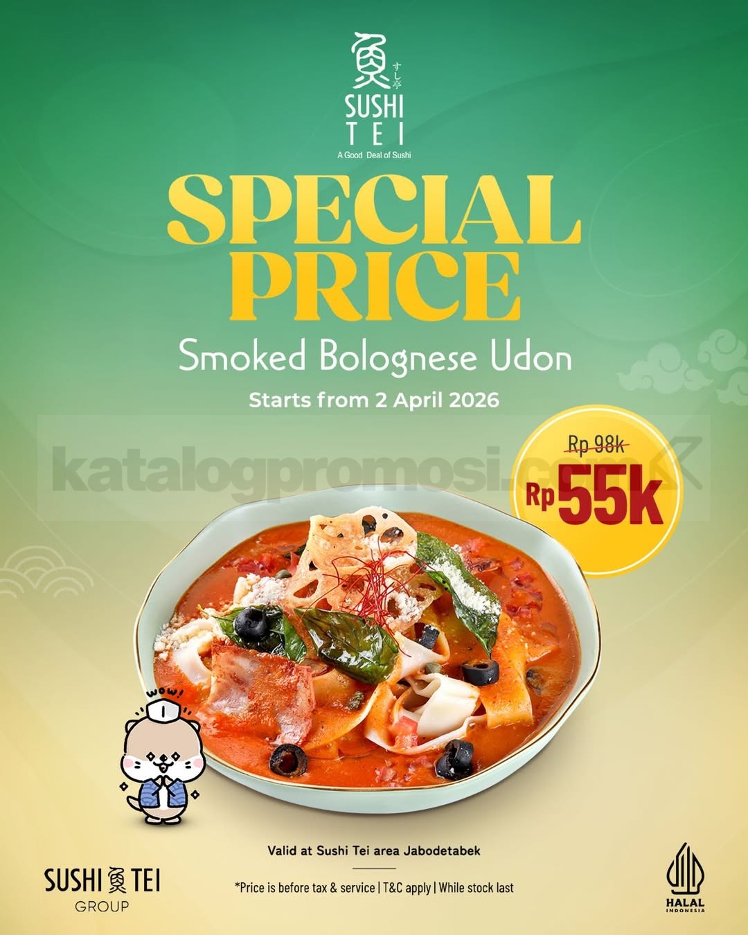 Promo Sushi Tei Smoked Bolognese Udon Rp. 55.000 nikmati menu spesial dine in tanpa minimum transaksi berlaku mulai tanggal 2 April 2026 di Jabodetabek