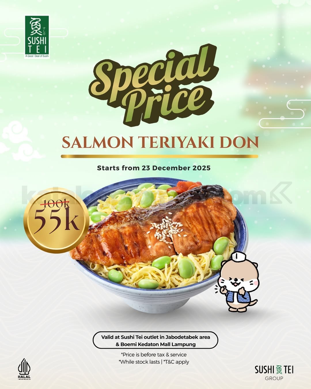 Promo Sushi Tei Special Price Salmon Teriyaki Don Rp. 55.000 menikmati menu salmon teriyaki don dengan harga spesial berlaku mulai tanggal 23 Desember 2025 di lokasi tertentu.