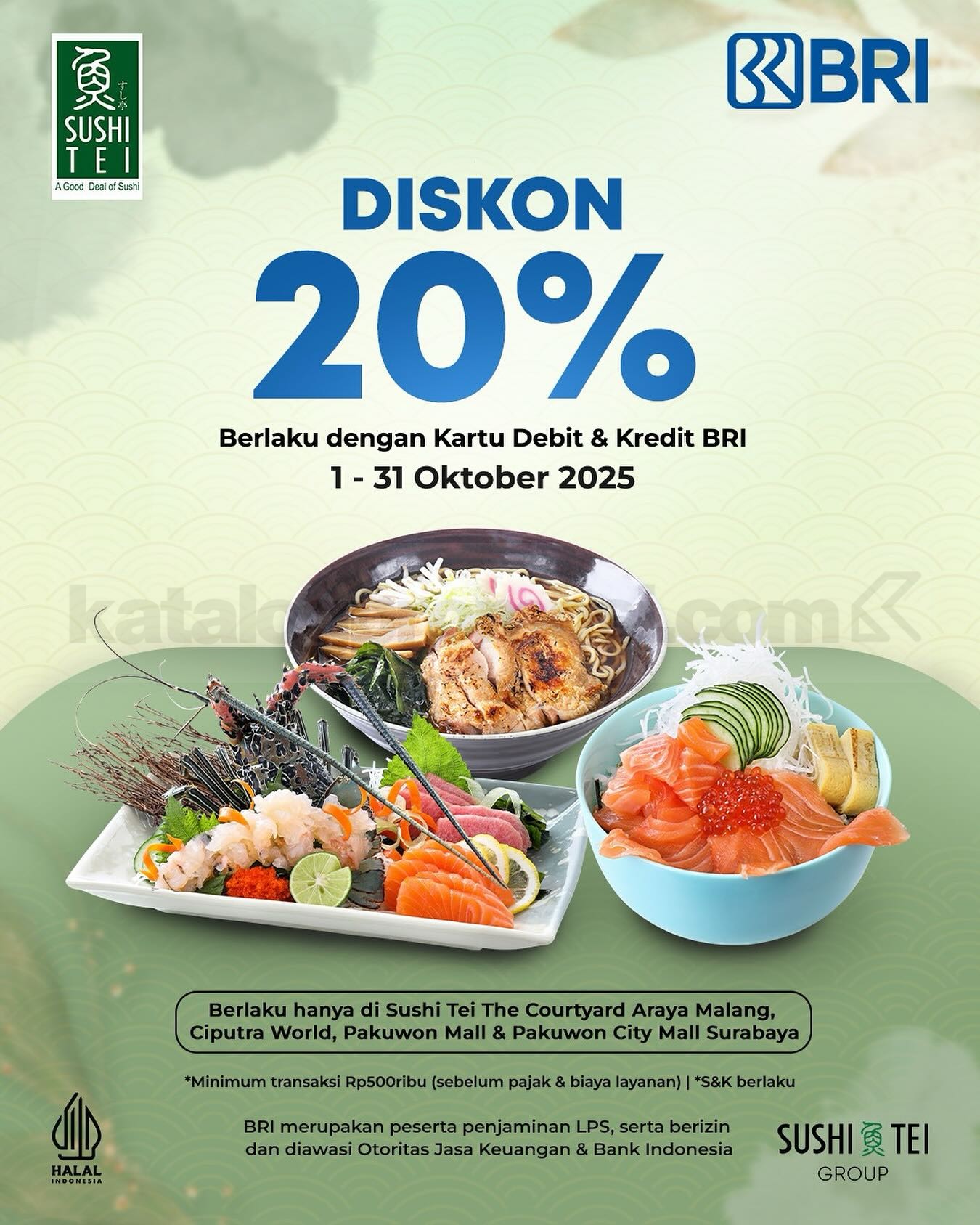Promo Sushi Tei BRI Diskon 20% berlaku 1โ31 Oktober 2025 dengan min. transaksi Rp500.000.