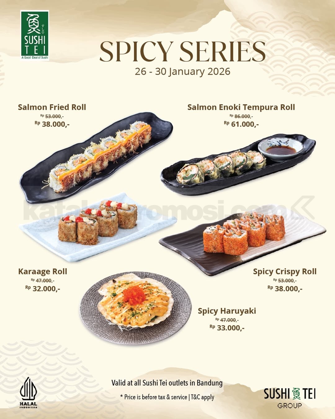 Promo Sushi Tei Spicy Series Sushi mulai Rp. 32.000 dengan pilihan menu pedas favorit, mekanisme dine-in, berlaku mulai tanggal 26 Januari 2026 – 30 Januari 2026 di seluruh outlet Sushi Tei Bandung.