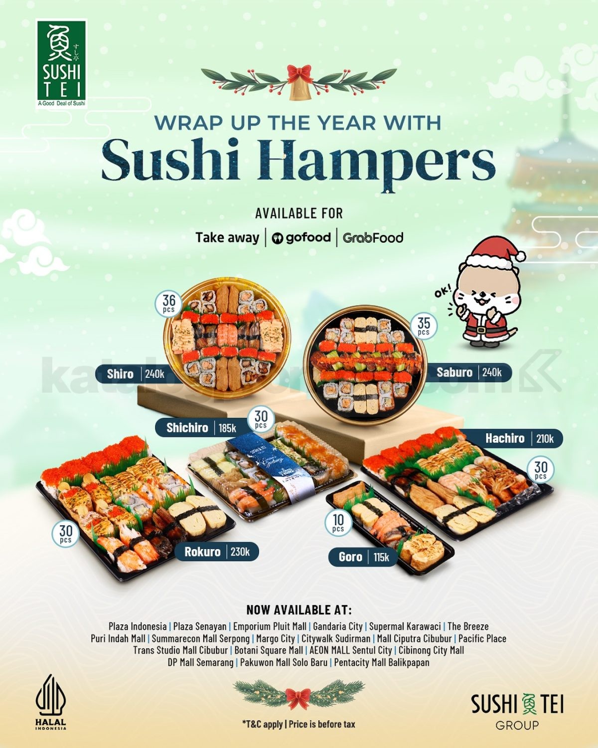 Nikmati promo Sushi Tei Sushi Hampers mulai Rp. 115.000 dan pilih hampers favorit untuk momen akhir tahun yang lebih spesial.