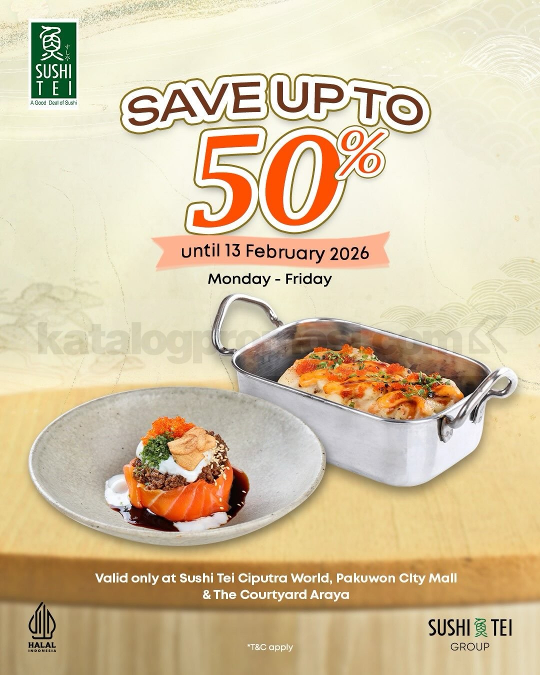 Promo Sushi Tei Weekday Feast diskon hingga 50% dengan harga menu pilihan mulai Rp. 31.000 untuk dine-in weekday, berlaku 13 Februari 2026 di lokasi tertentu.