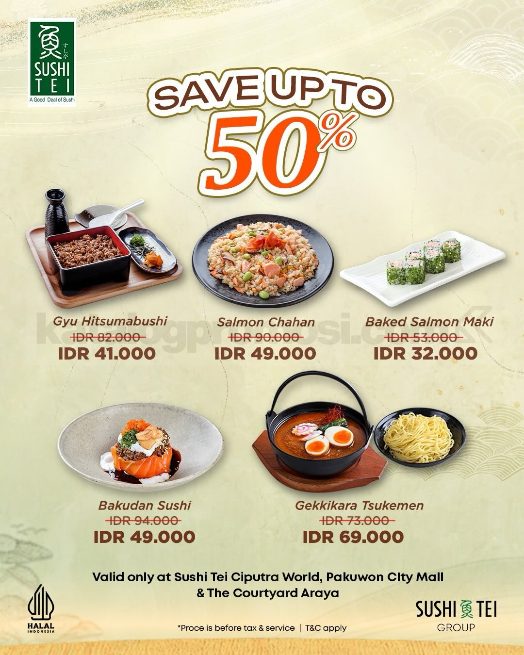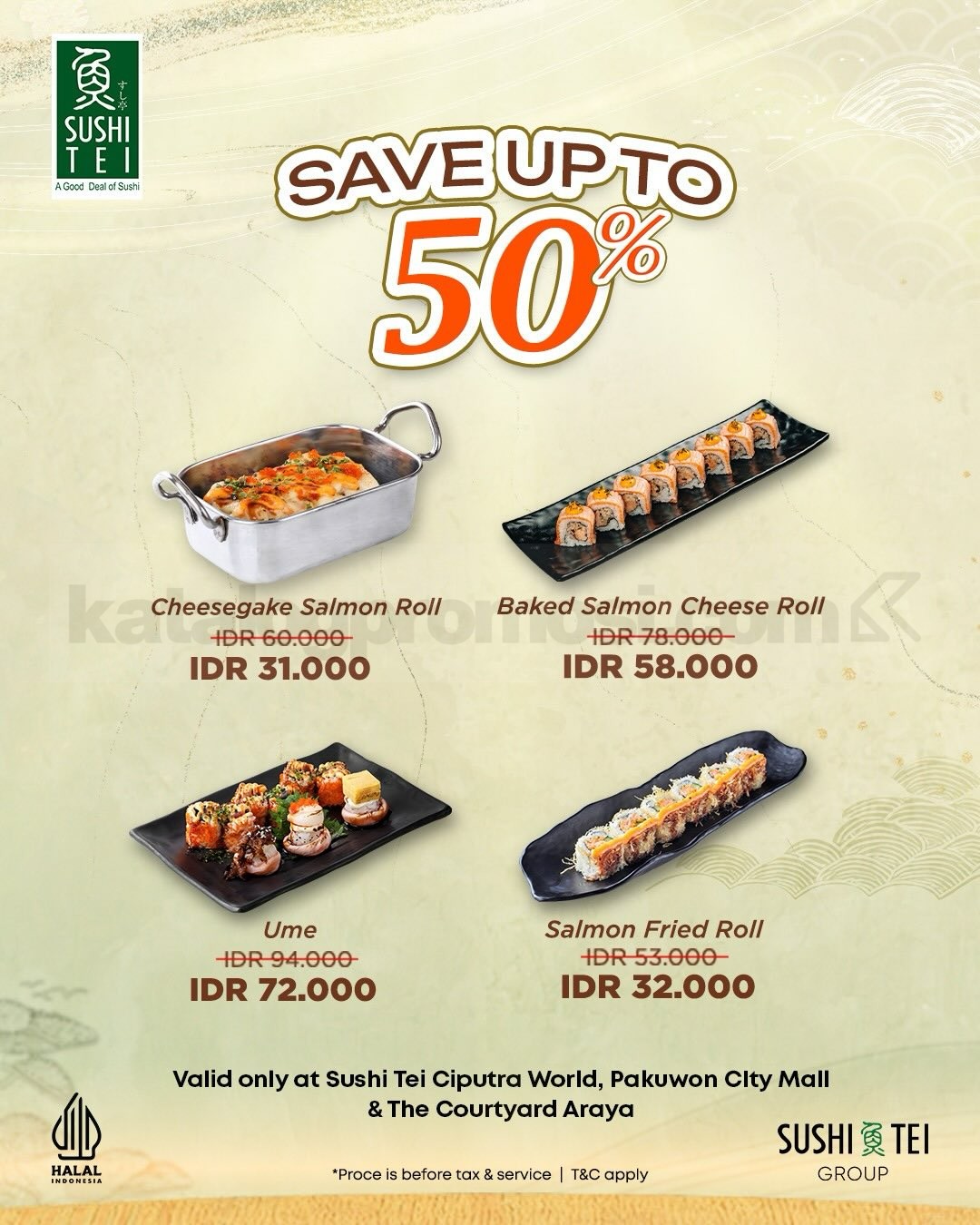 • Diskon hingga 50% untuk menu pilihan Sushi Tei