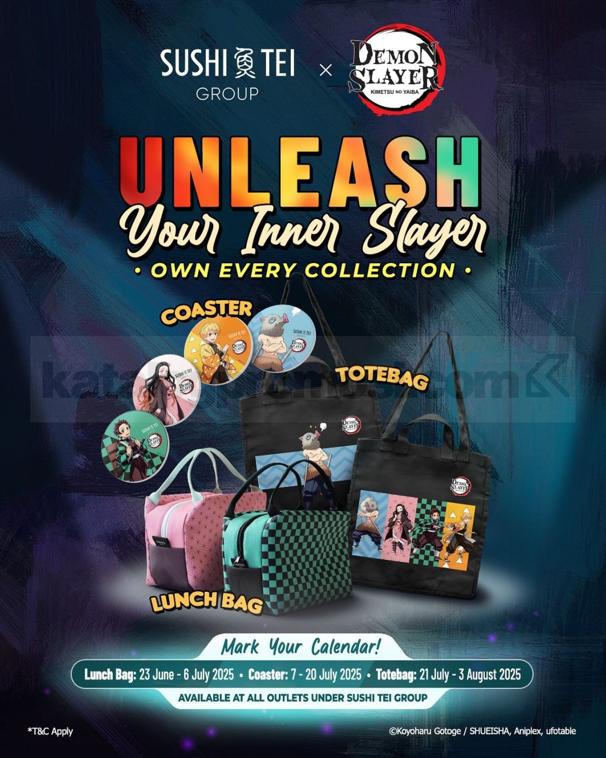 Promo Sushi Tei x Demon Slayer 2025! Koleksi merchandise eksklusif Lunch Bag, Coaster & Totebag tersedia di seluruh outlet mulai 23 Juni, stok terbatas!
