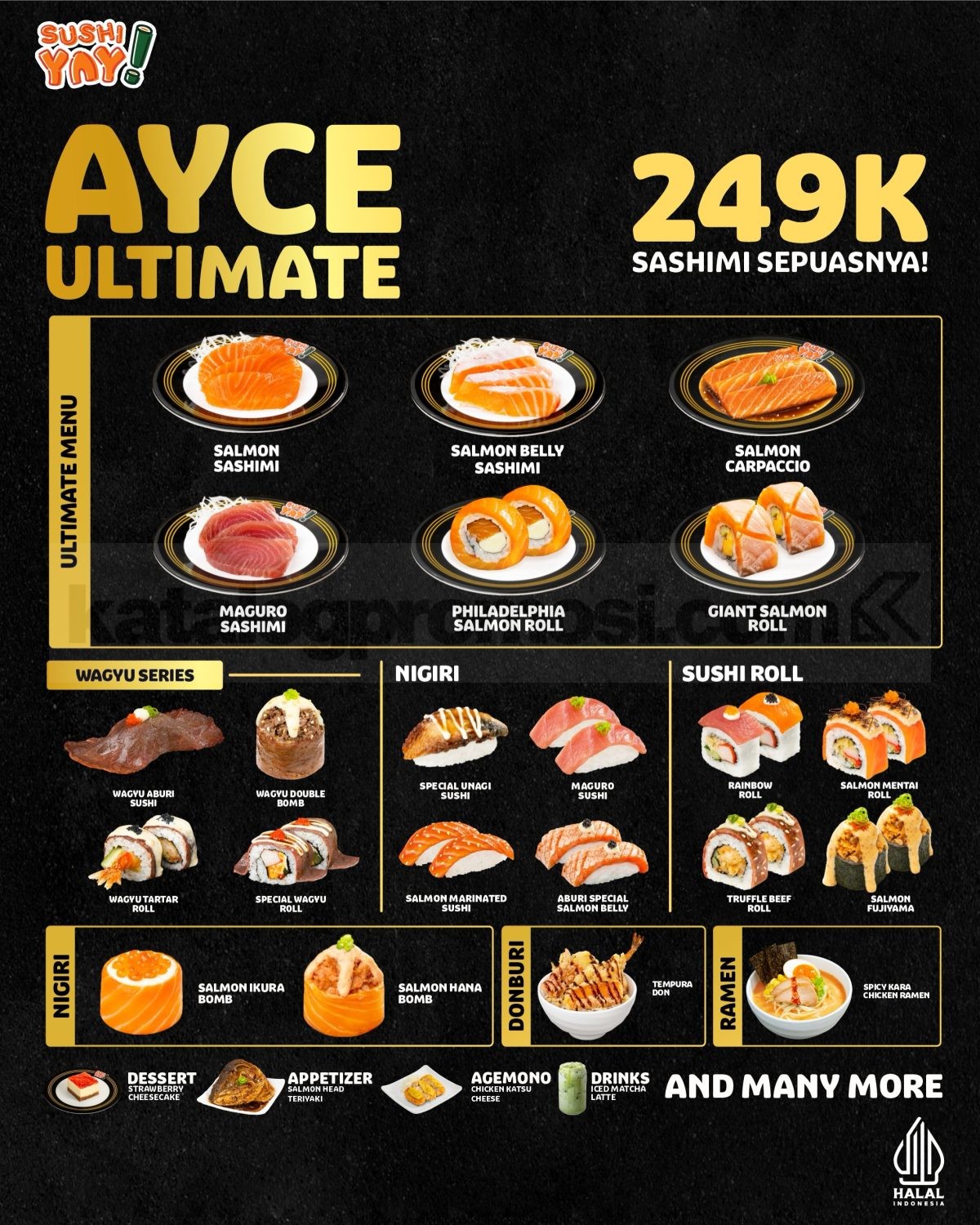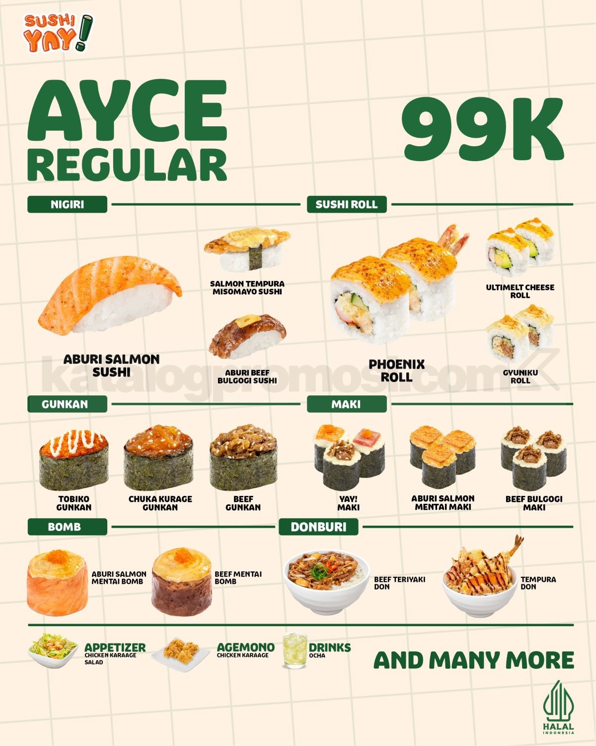 - Terdapat menu khusus AYCE. Menu yang dipesan di luar menu AYCE akan dikenakan biaya reguler.