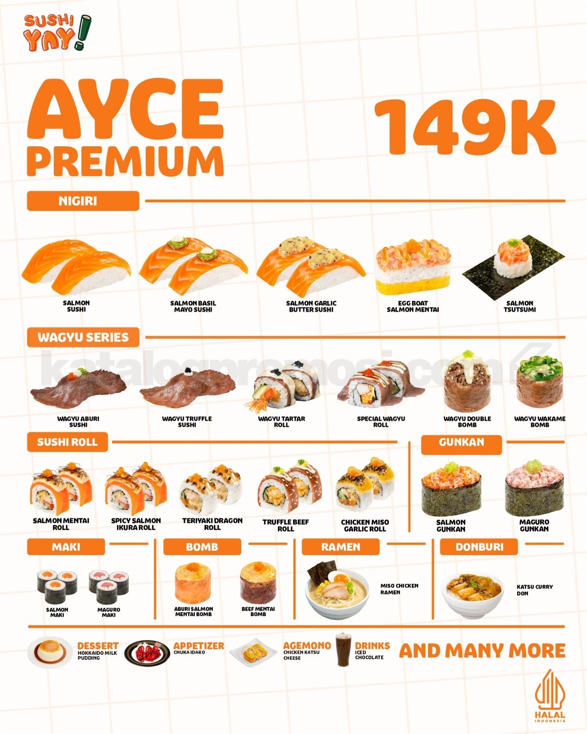 Pilihan menu lebih lengkap seperti Salmon Sushi, Salmon Basil Mayo Sushi, Wagyu Aburi Sushi, Wagyu Truffle Sushi, Salmon Mentai Roll, Teriyaki Dragon Roll, Katsu Curry Don, Miso Chicken Ramen, Hokkaido Milk Pudding, Chicken Katsu Cheese, dan Iced Chocolate.