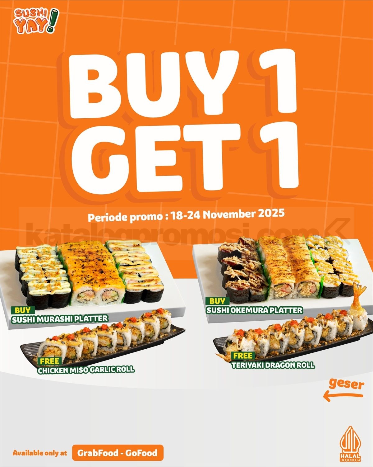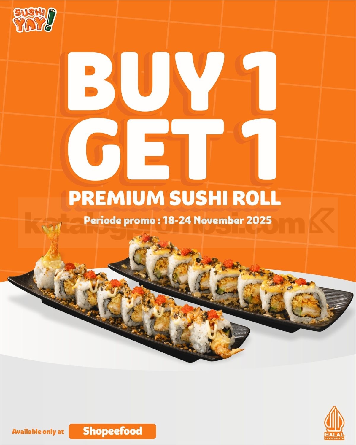 Promo Sushi Yay Buy 1 Get 1 Premium Roll untuk menu platter dan premium roll via GrabFood, GoFood, dan ShopeeFood berlaku 18โ24 November 2025.