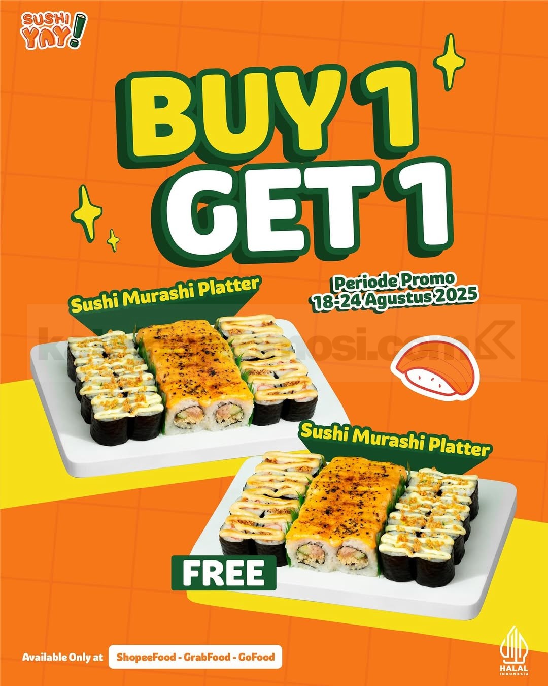 pastikan kamu manfaatkan penawaran Sushi Yay Buy 1 Get 1 Premium Roll selama periode berlangsung agar tidak ketinggalan menu gratisnya.