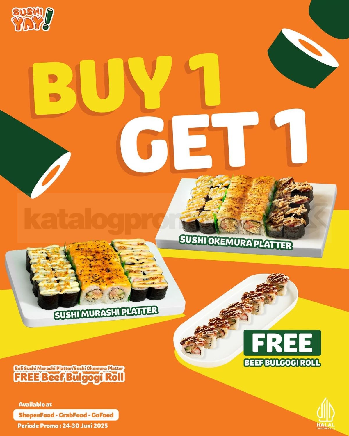 Promo Sushi Yay BUY 1 GET 1 hadir di GoFood, GrabFood, ShopeeFood! Beli Sushi Platter, gratis Beef Gyuniku Roll. Berlaku 17β23 September 2025.
