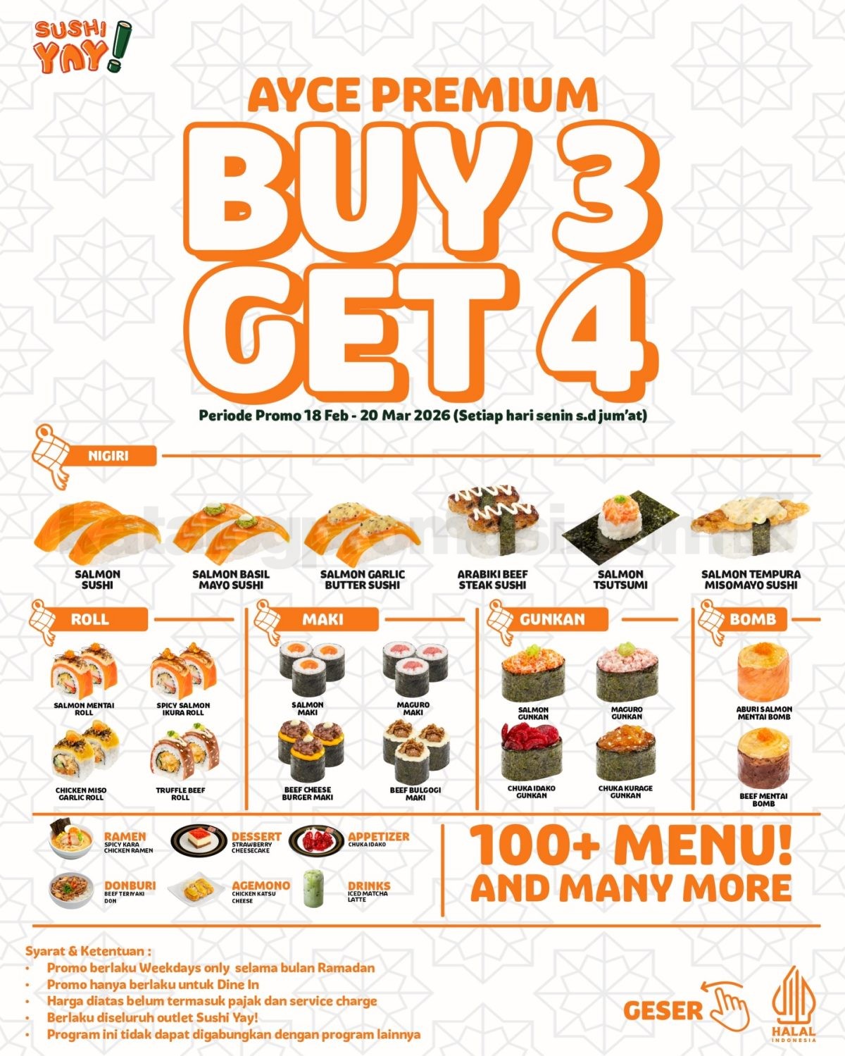 AYCE Premium Buy 3 Get 4 berlaku 18 Februari 2026 – 20 Maret 2026 (Senin–Jumat).