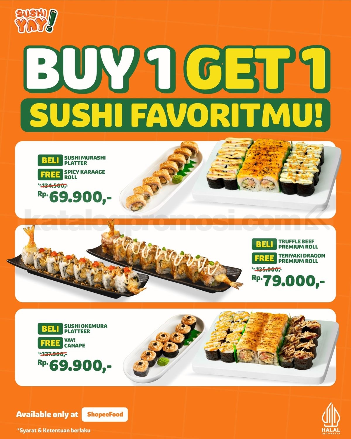 Promo Sushi Yay! ShopeeFood Buy 1 Get 1 Sushi Favorit mulai Rp. 69.900 dengan pembelian menu pilihan via ShopeeFood, berlaku selama periode promo di ShopeeFood.