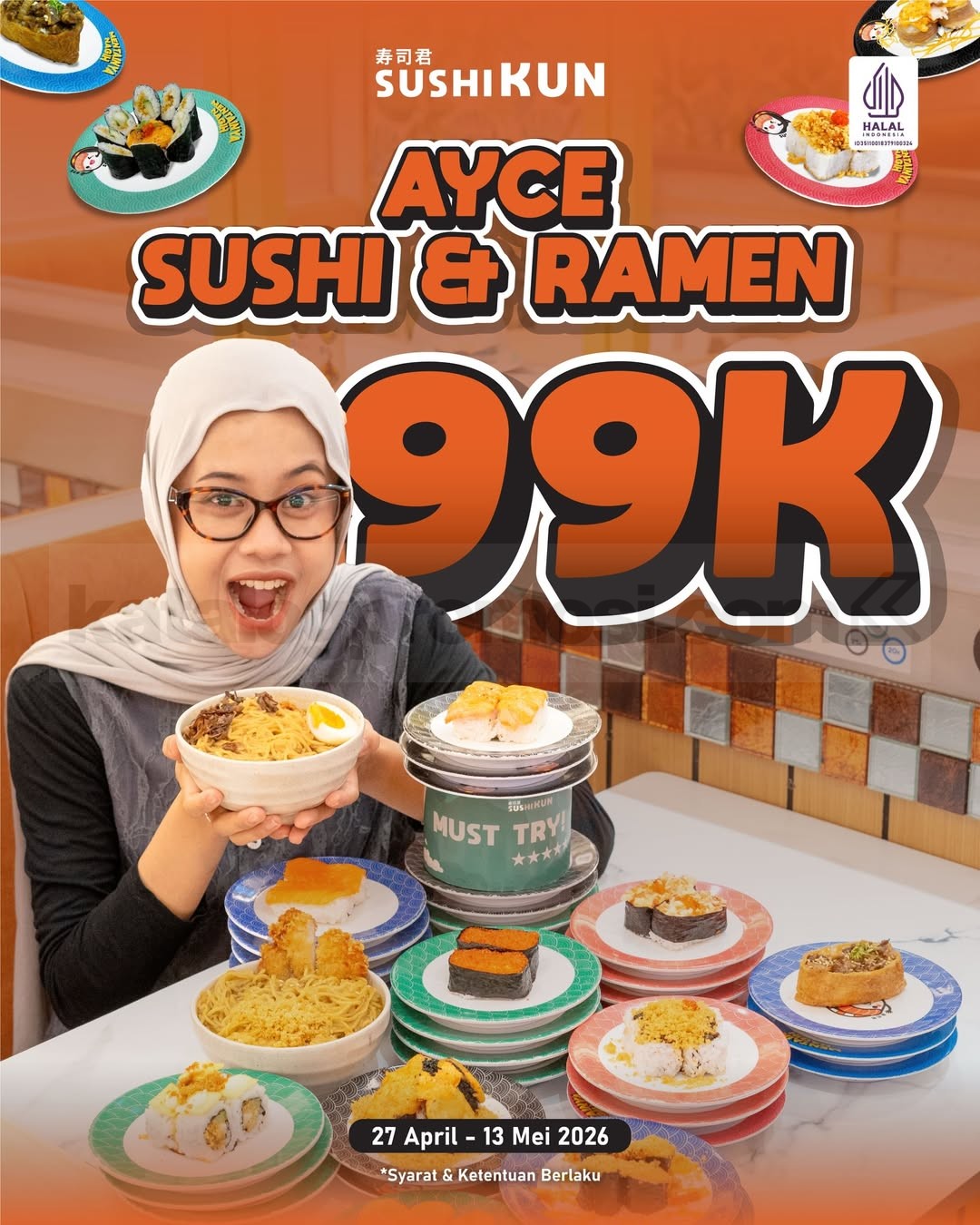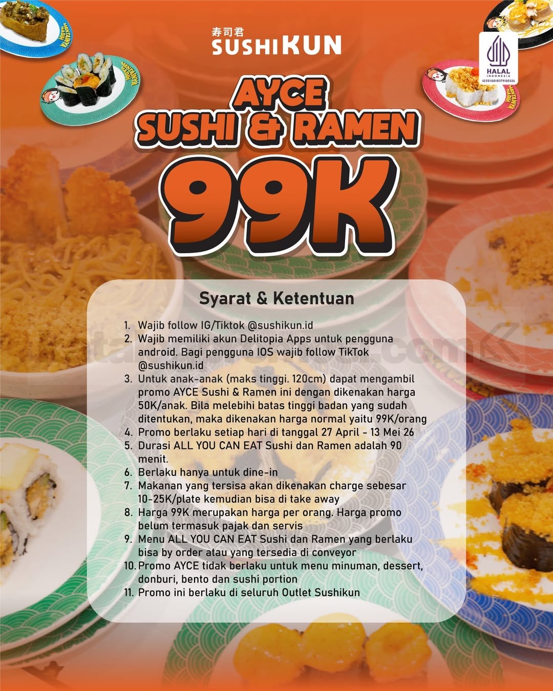 Promo Sushikun All You Can Eat Sushi & Ramen Rp. 99.000 makan sepuasnya 90 menit berlaku mulai tanggal 27 April 2026 – 13 Mei 2026 di seluruh outlet