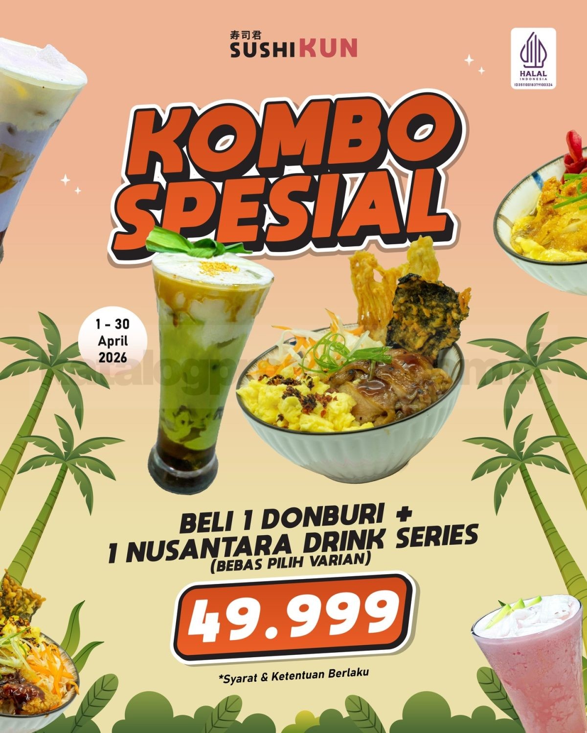 Promo Sushikun April Combo Donburi Minuman Rp. 49.999 paket hemat donburi dan minuman berlaku mulai tanggal 1 April 2026 – 30 April 2026 di Jabar dan Jakarta