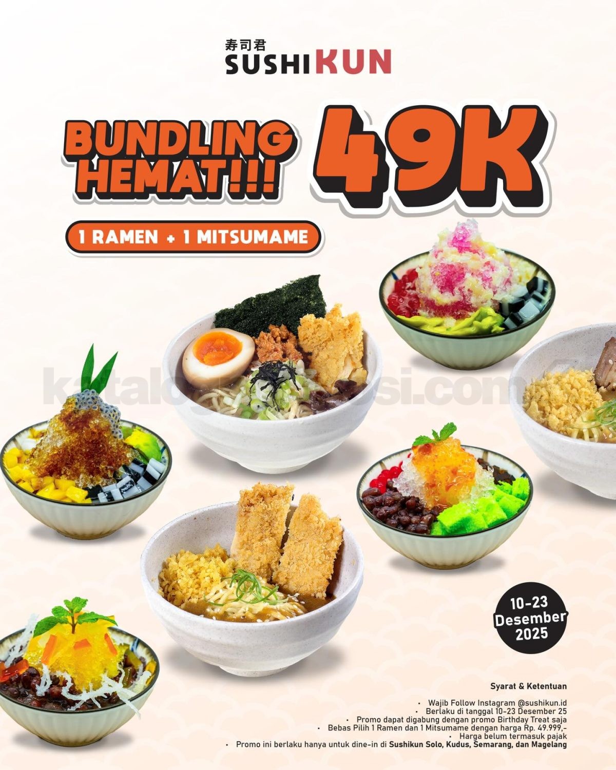 Promo Sushikun Bundling Hemat Rp. 49.999 dapat 2 menu favorit termasuk ramen & dessert + follow IG, berlaku 10-23 Desember 25 di outlet tertentu.