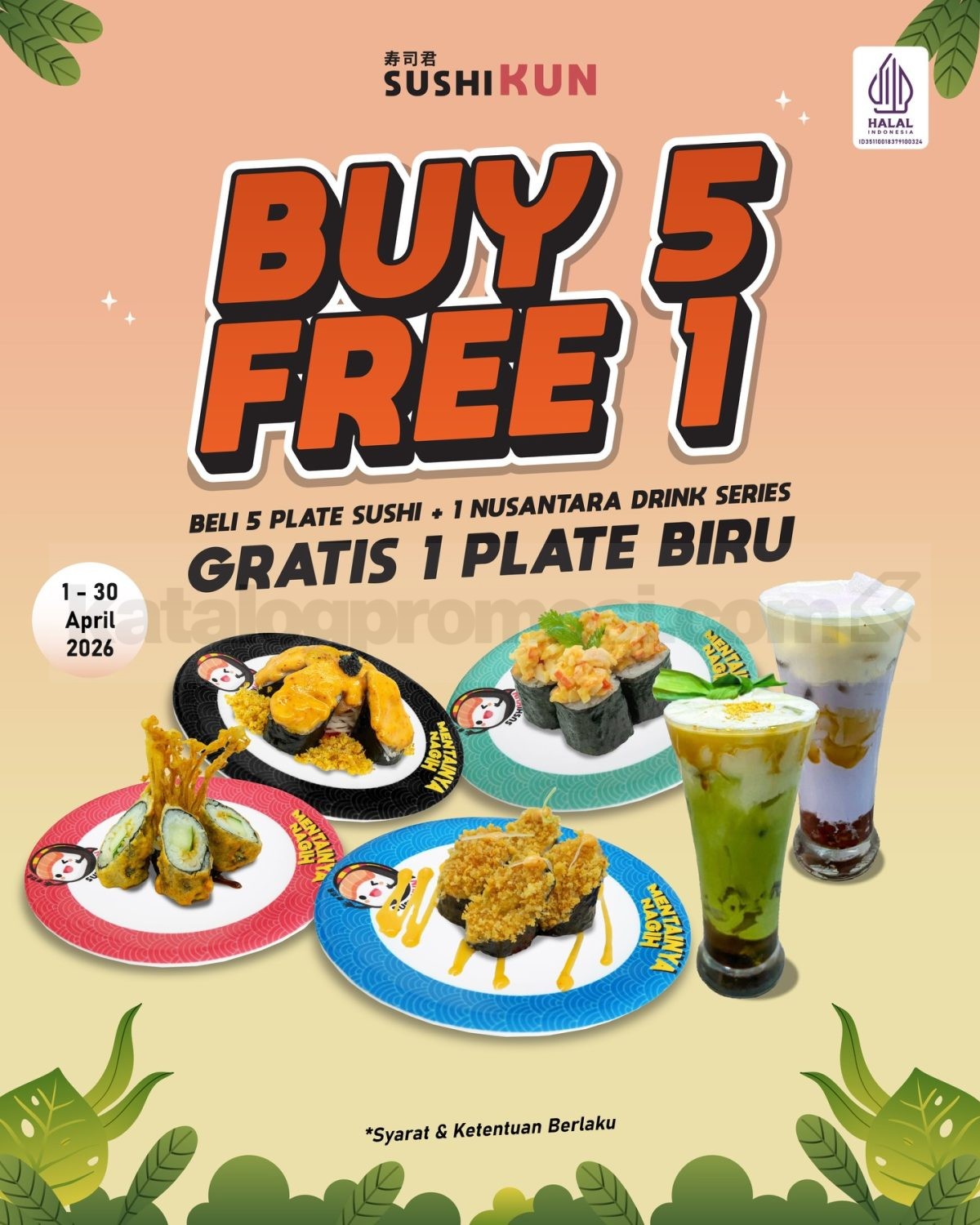 Promo Sushikun Buy 5 Get 1 Free Blue Plate Sushi dengan pembelian 5 Sushi semua varian dan minuman Nusantara Series berlaku mulai tanggal 1 April 2026 – 30 April 2026 di Sushikun JATENG.