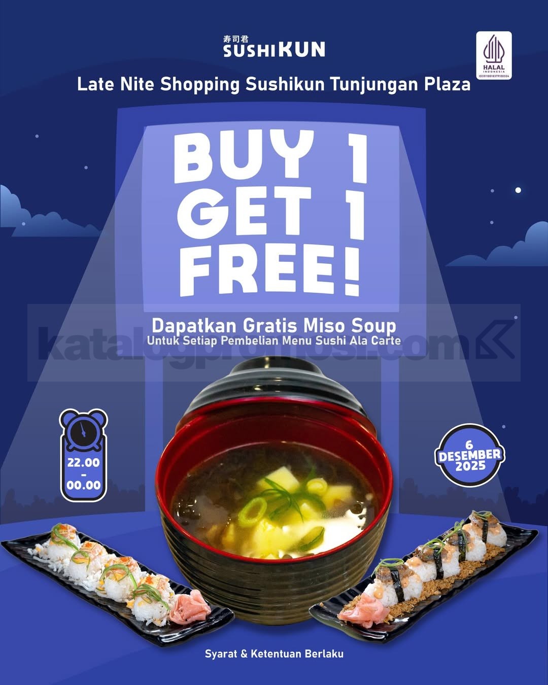 Promo Sushikun Late Night Sale Buy 1 Get 1 Free nikmati gratis Miso Soup untuk pembelian sushi ala carte, berlaku 6 Desember 2025 jam 22.00-00.00 di Tunjungan Plaza.