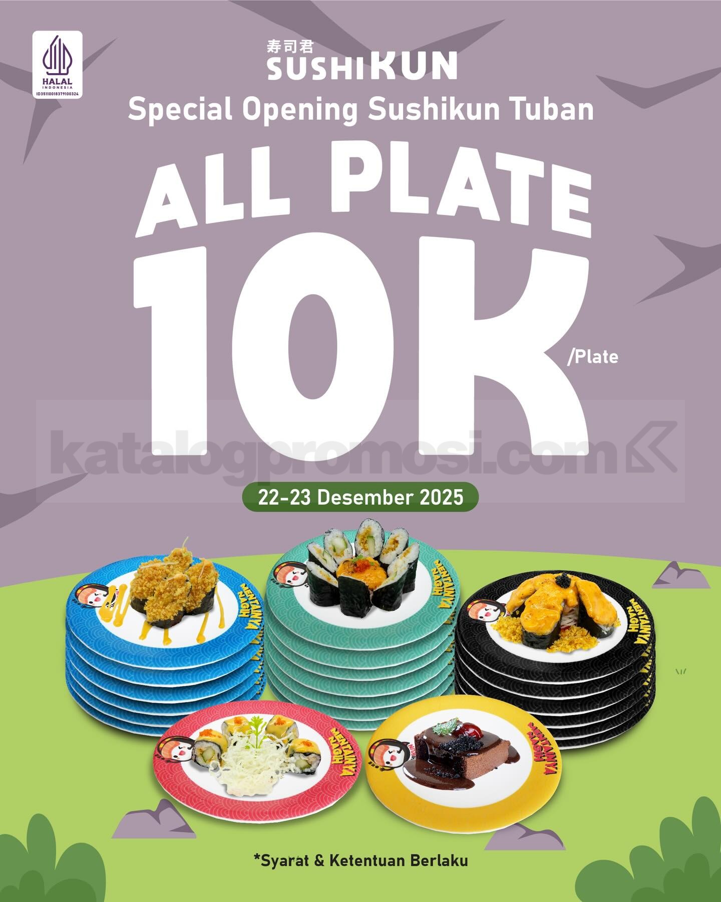 Promo Sushikun Opening Tuban All Sushi Rp. 10.000 per plate dengan beragam pilihan sushi favorit, berlaku 22 Desember 2025 – 23 Desember 2025 di Citimall Tuban.