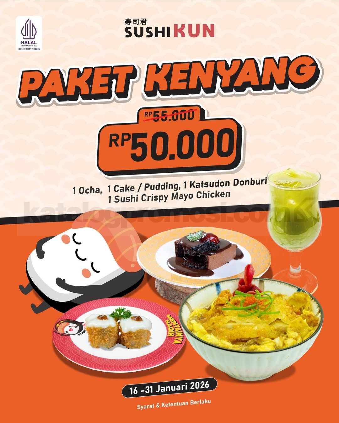 Promo Sushikun Paket Kenyang Lengkap Rp. 50 ribu dengan donburi, sushi, ocha, dan dessert berlaku mulai tanggal 16 Januari 2026 – 31 Januari 2026 di seluruh outlet Sushikun Jawa Timur