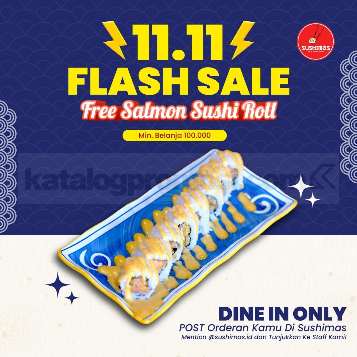 Promo Sushimas 11.11 Flash Sale Free Salmon Sushi Roll, belanja min. Rp. 100.000 dine-in dan mention @sushimas.id, berlaku 11 November di seluruh cabang.