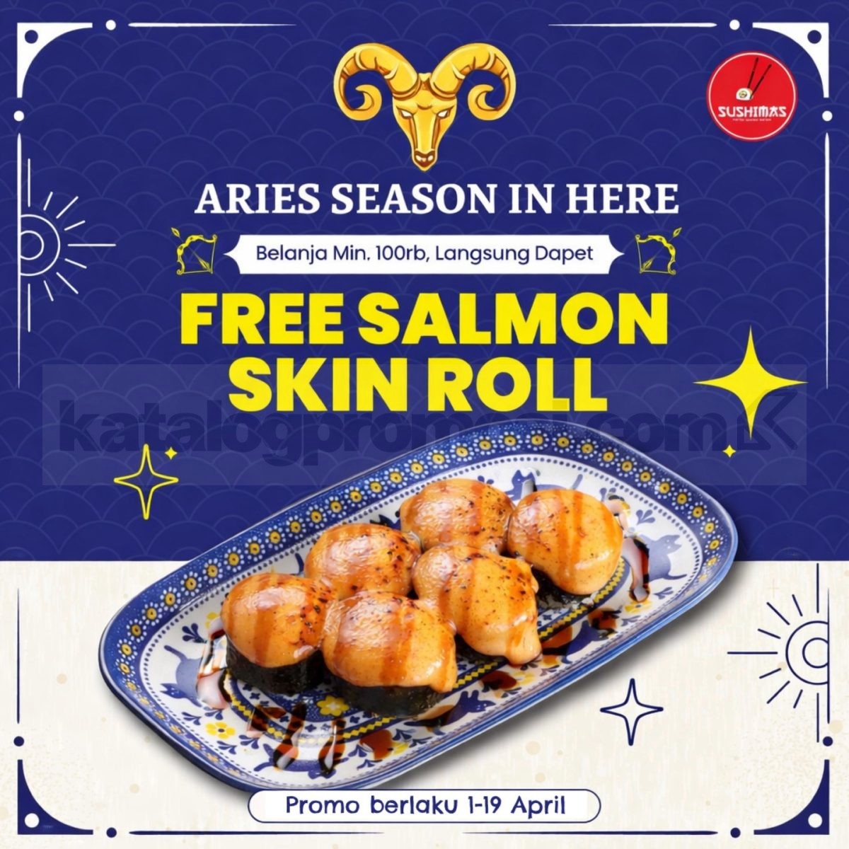 Hello Aries! βοΈ Promo Sushimas Aries Free Salmon Skin Roll ini jadi momen spesial buat kamu yang berzodiak Aries untuk menikmati bonus menu favorit saat makan di Sushimas β¨