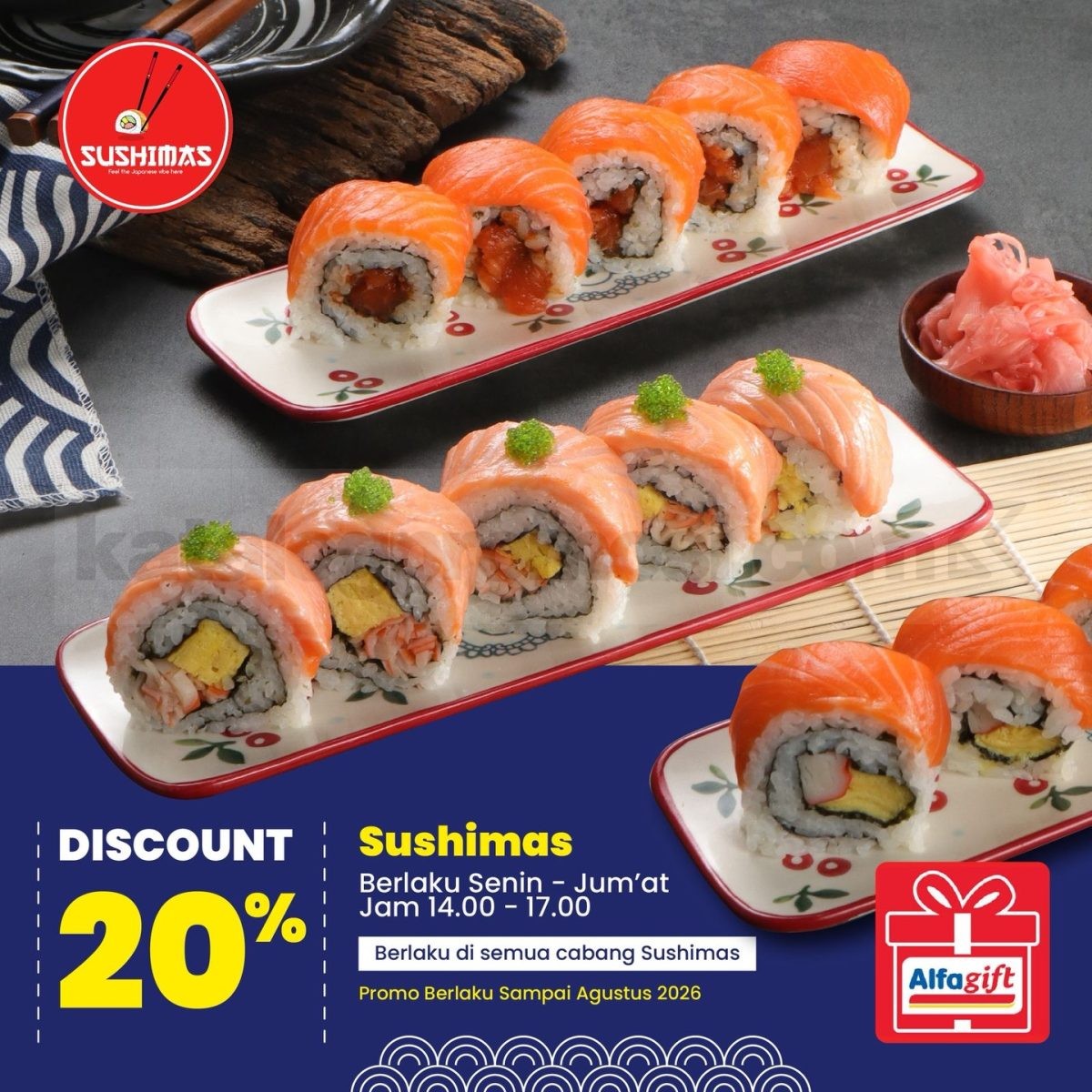 Promo Sushimas Discount 20% sushi via Alfagift dengan potongan harga menarik, berlaku Senin–Jum’at pukul 14.00–17.00 di seluruh cabang, berlaku mulai sekarang hingga Agustus 2026.