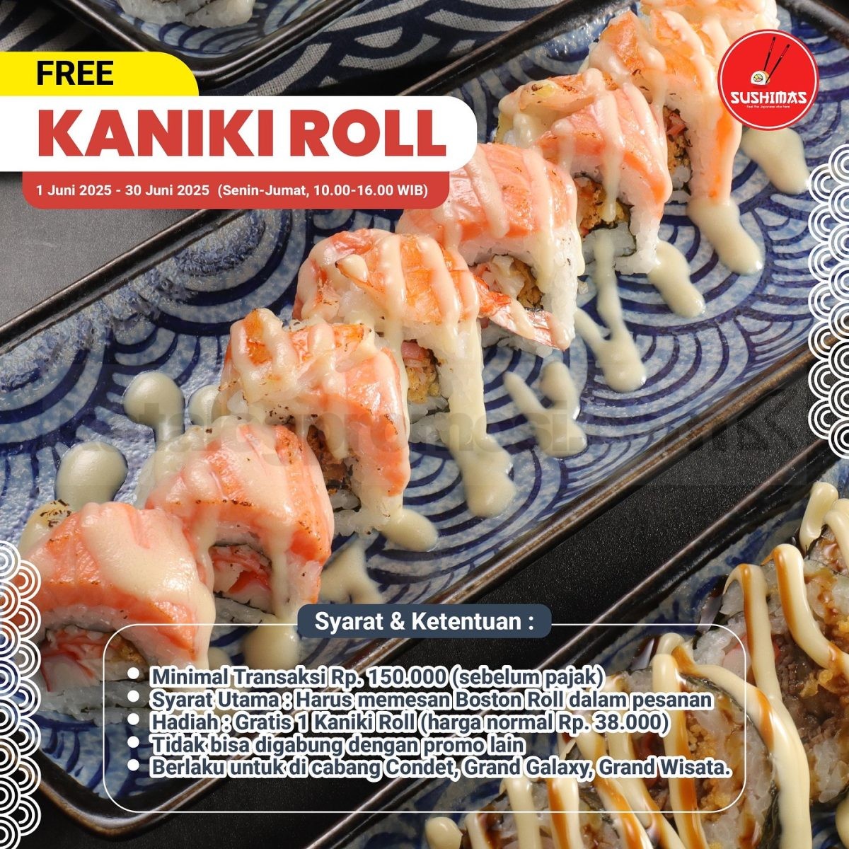 Promo Sushimas Gratis Kaniki Roll dengan transaksi Rp150.000 dan pesan Boston Roll. Berlaku mulai tanggal 01 – 30 Juni 2025.