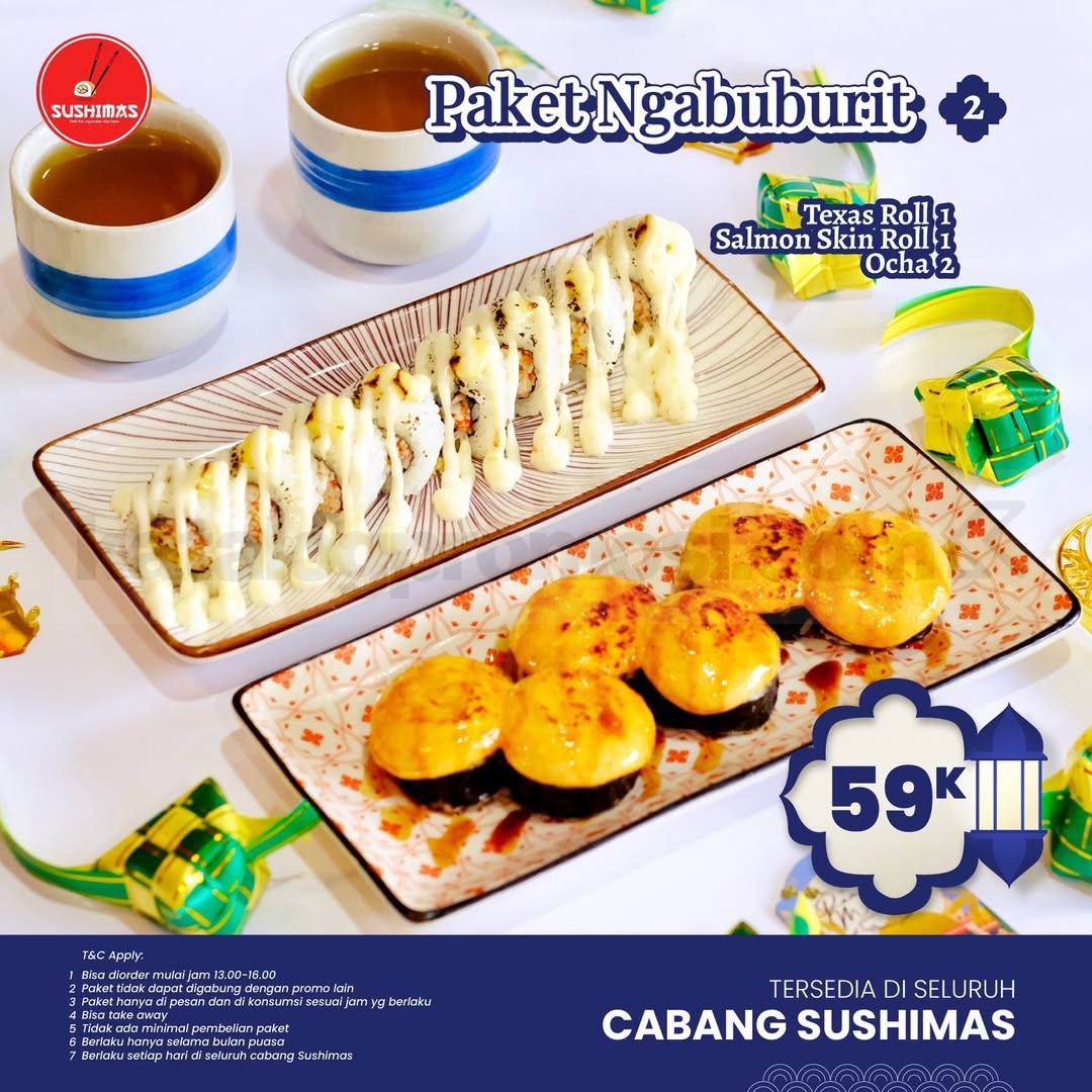 Promo Sushimas Paket Ngabuburit mulai Rp. 59.000 paket sushi & ocha jam tertentu berlaku selama bulan puasa di seluruh outlet