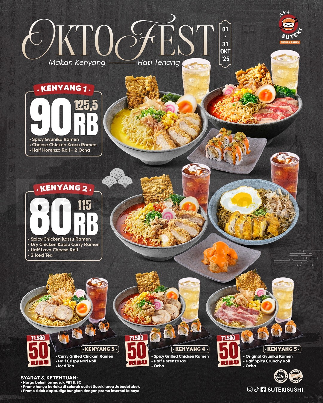 Promo Suteki Sushi Okto Fest Paket Kenyang mulai dari RP50ribu aja kamu udah bisa nikmatin makan ramen+sushi+minum loh.