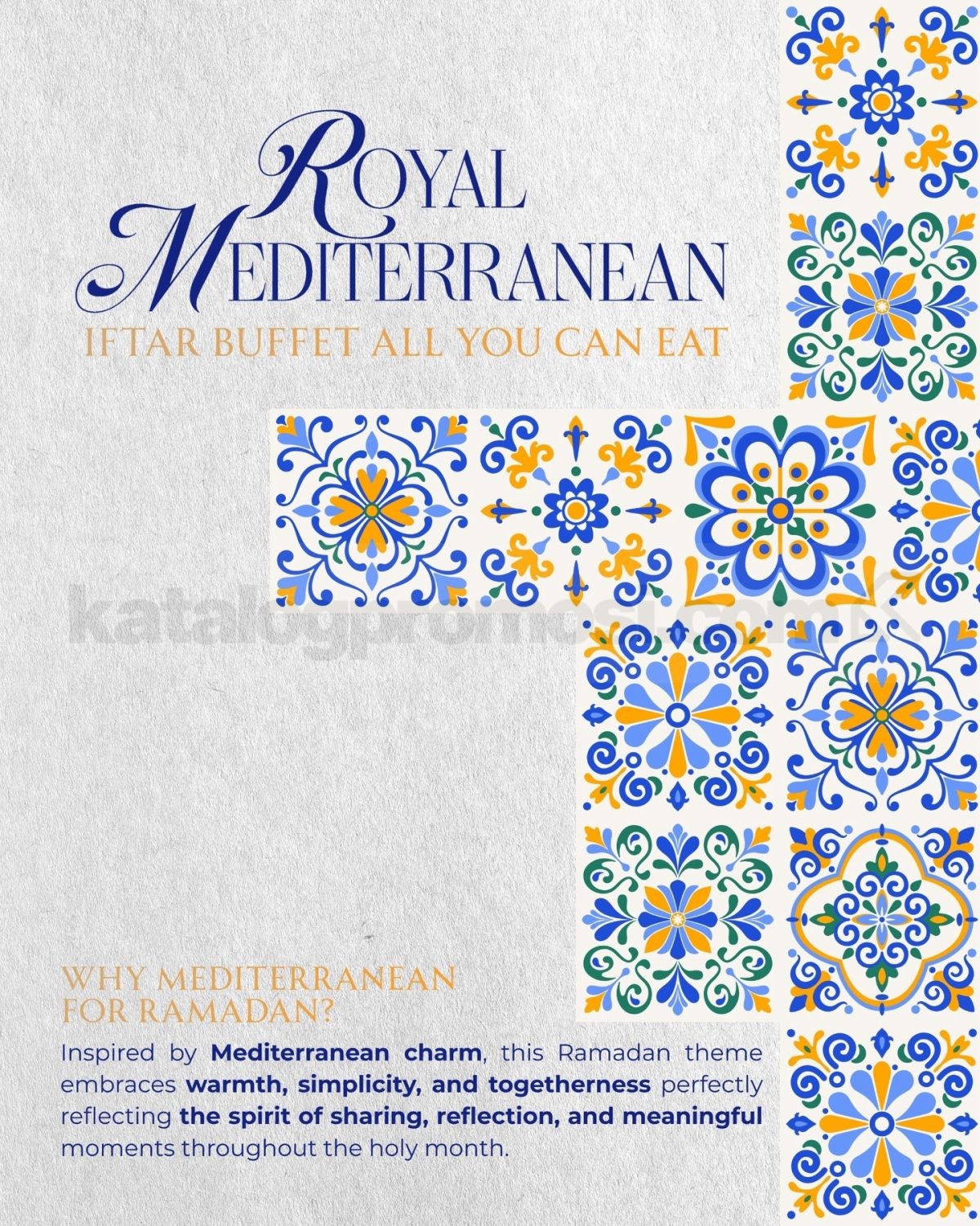 Ramadan this year, Royal Mediterranean Iftar Buffet siap menemani waktu berbuka dengan suasana yang hangat dan penuh kebersamaan. Konsep Mediterania dihadirkan dengan sentuhan sederhana namun elegan, selaras dengan momen berbagi dan refleksi selama bulan suci.
