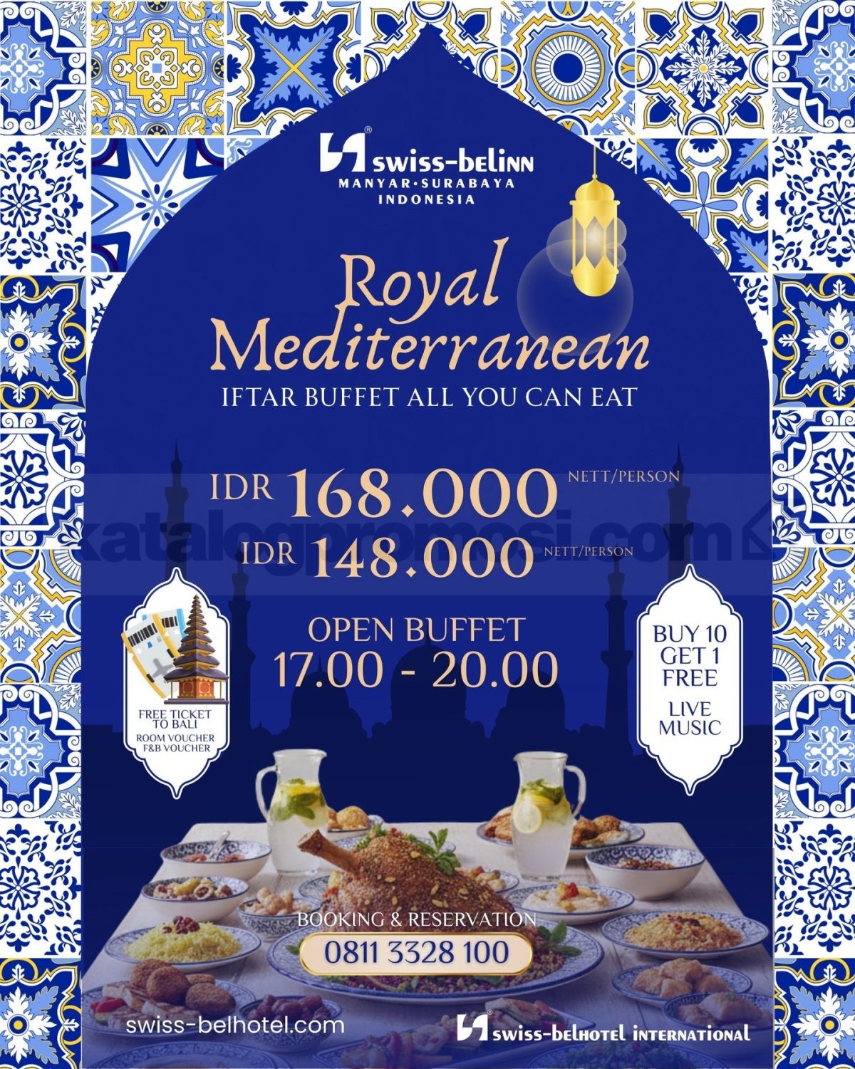 Promo SWISS-BELINN Manyar Surabaya Royal Mediterranean Iftar Buffet all you can eat Rp. 168.000 nett atau Rp. 148.000 nett, buka pukul 17.00–20.00 selama Ramadan di Surabaya.