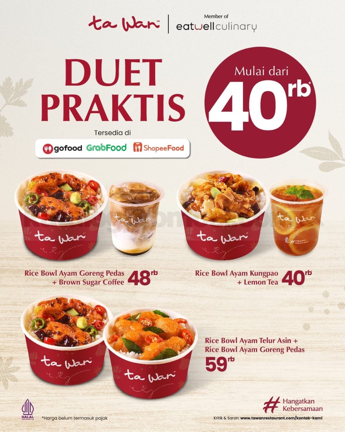 Jangan tunggu laper banget baru mikir! Yuk langsung pesan Promo Ta Wan Duet Praktis Rice Bowl + Coffee & Tea Series sekarang juga lewat aplikasi andalan kamu. Bisa makan kenyang, minum segar, dan nikmatin momen sharing yang makin seru. ✨🍛