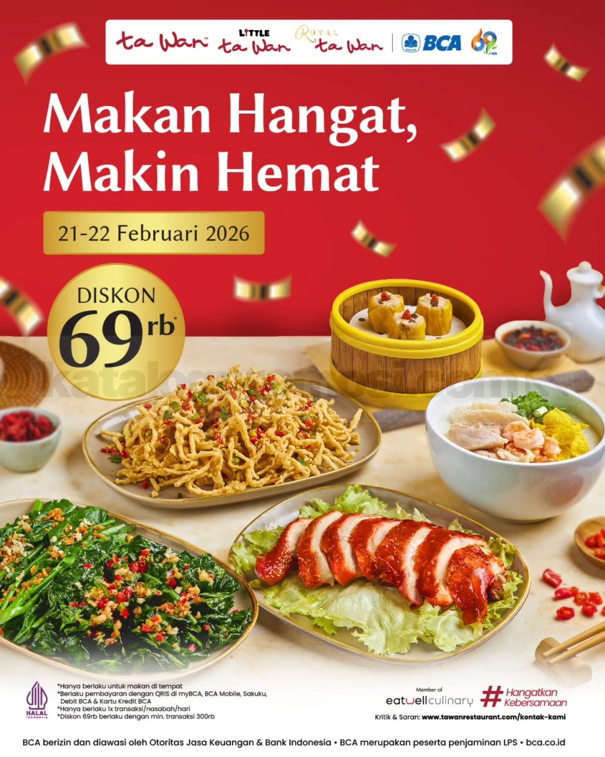 Nasabah BCA bisa menikmati diskon Rp. 69.000 pada 21 – 22 Februari 2026 di Little Ta Wan, Ta Wan, dan Royal Ta Wan. Potongan berlaku untuk minimal pembelian Rp. 300.000 sebelum pajak dan servis.