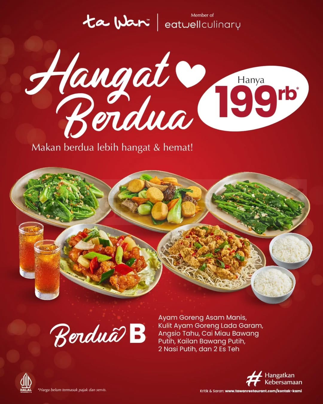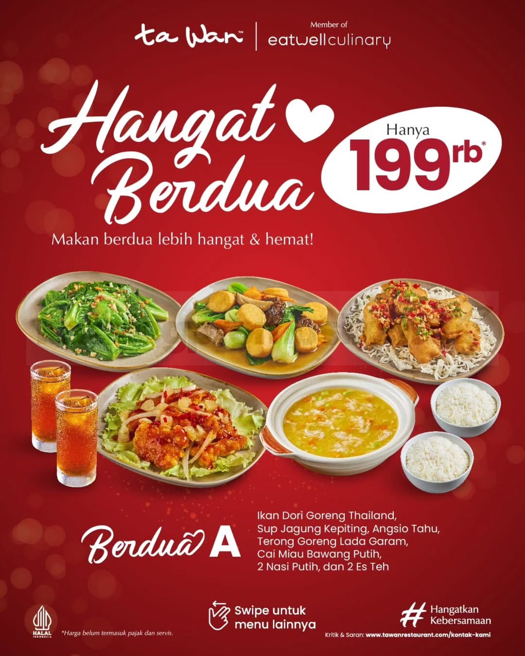 Kalau kamu lagi cari cara simpel buat makan enak berdua tanpa ribet, paket ini bisa jadi pilihan yang pas. Menunya lengkap, porsinya cukup, dan harganya juga lebih hemat. Yuk ajak orang tersayang dan nikmati momen hangat bareng di Ta Wan!