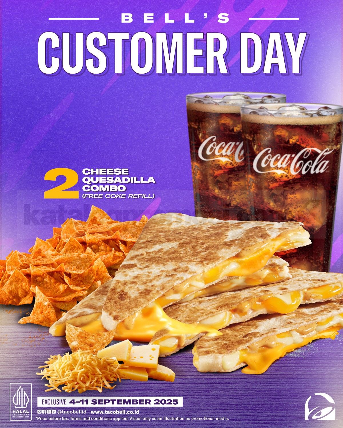 It’s Bell’s Customer Day 💜 Saatnya nikmatin double cheese, double happiness bareng Taco Bell! 🧀✨ Spesial edisi Customer Day, kamu bisa menikmati 2 Cheese Quesadilla Combo lengkap dengan FREE Coke refill hanya Rp65.454.