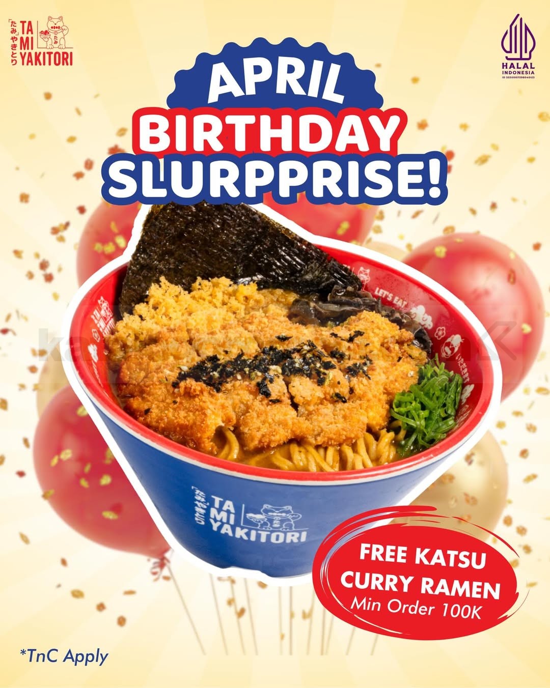 Promo Tami Yakitori Birthday Slurpprise gratis Katsu Curry Ramen dengan min. transaksi Rp. 100.000 berlaku 1 April 2026 – 30 April 2026 di outlet tertentu