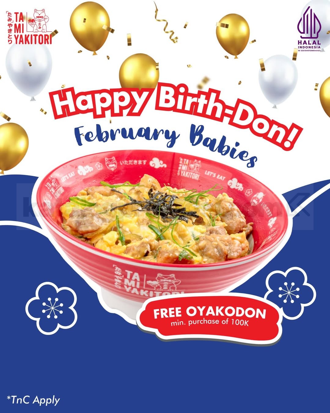 Happy Birth-Don, February Babies! 🎉🎂 Promo Tami Yakitori Birthday Treats Gratis Oyakodon jadi cara paling seru buat merayakan ulang tahun kamu yang lahir di bulan Februari. Selama periode promo, kamu bisa menikmati FREE Oyakodon dengan minimum pembelian Rp. 100.000 saat dine in — traktiran spesial dari Tami Yakitori untuk hari istimewamu.